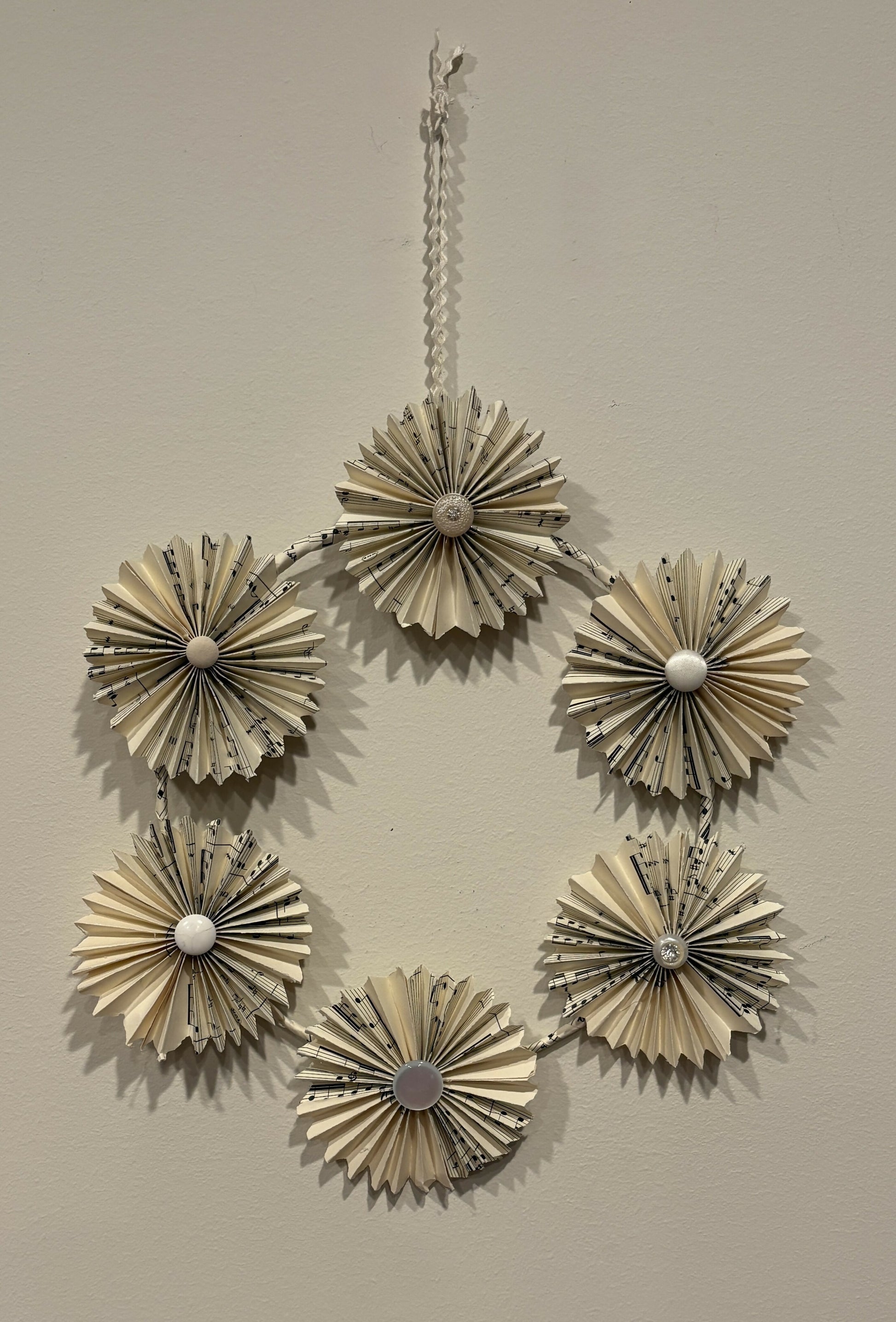 Old Lace was created using JS Bach music sheets, white, cream and rhinestone vintage buttons and is tied up with white rick rack trim. She is 11” x 11” and completely made of upcycled and recycled materials.