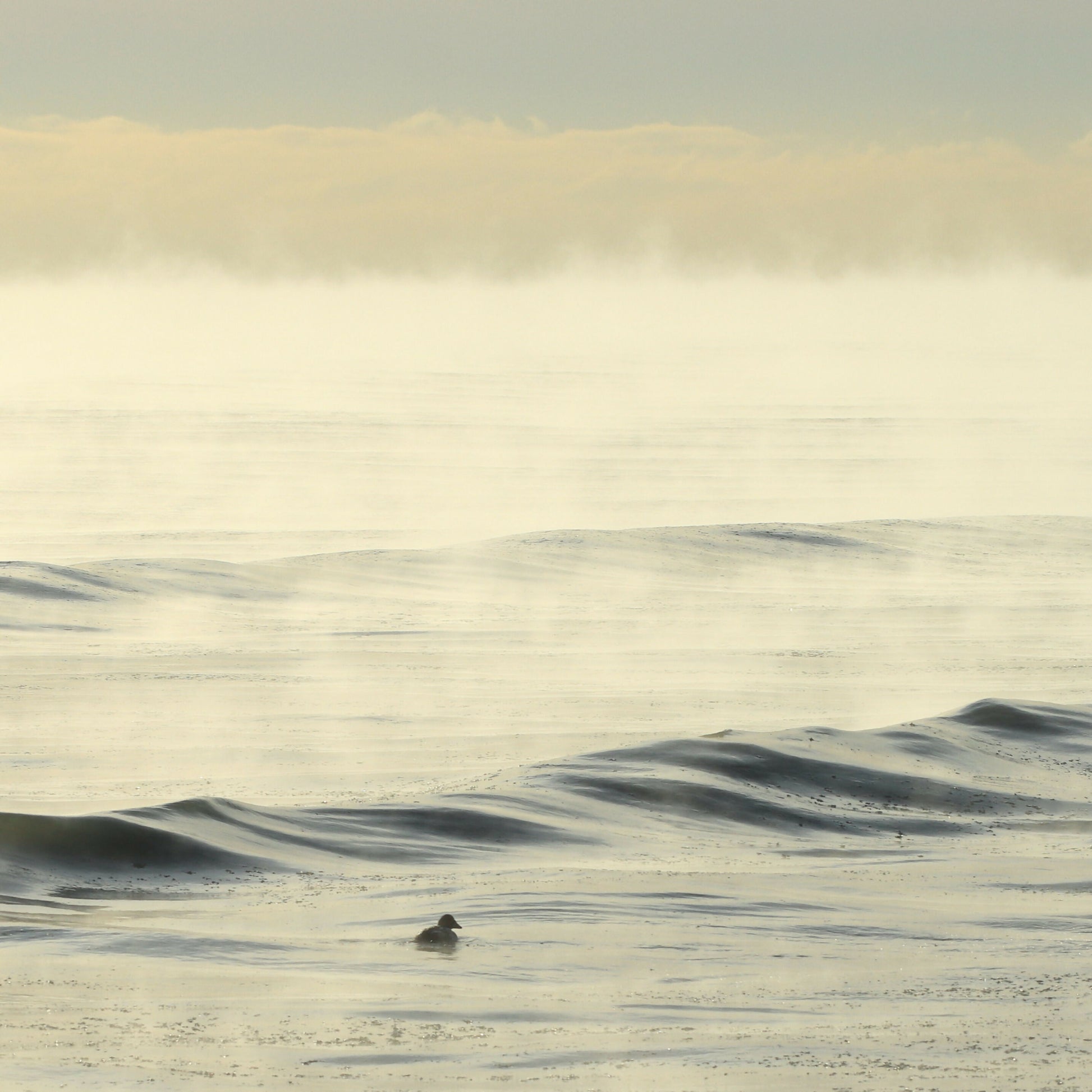 a merganser paddles in Lake Michigan on a bitterly cold morning. Light waves rollin towards it, and "smoke" wafts over the water's surface.