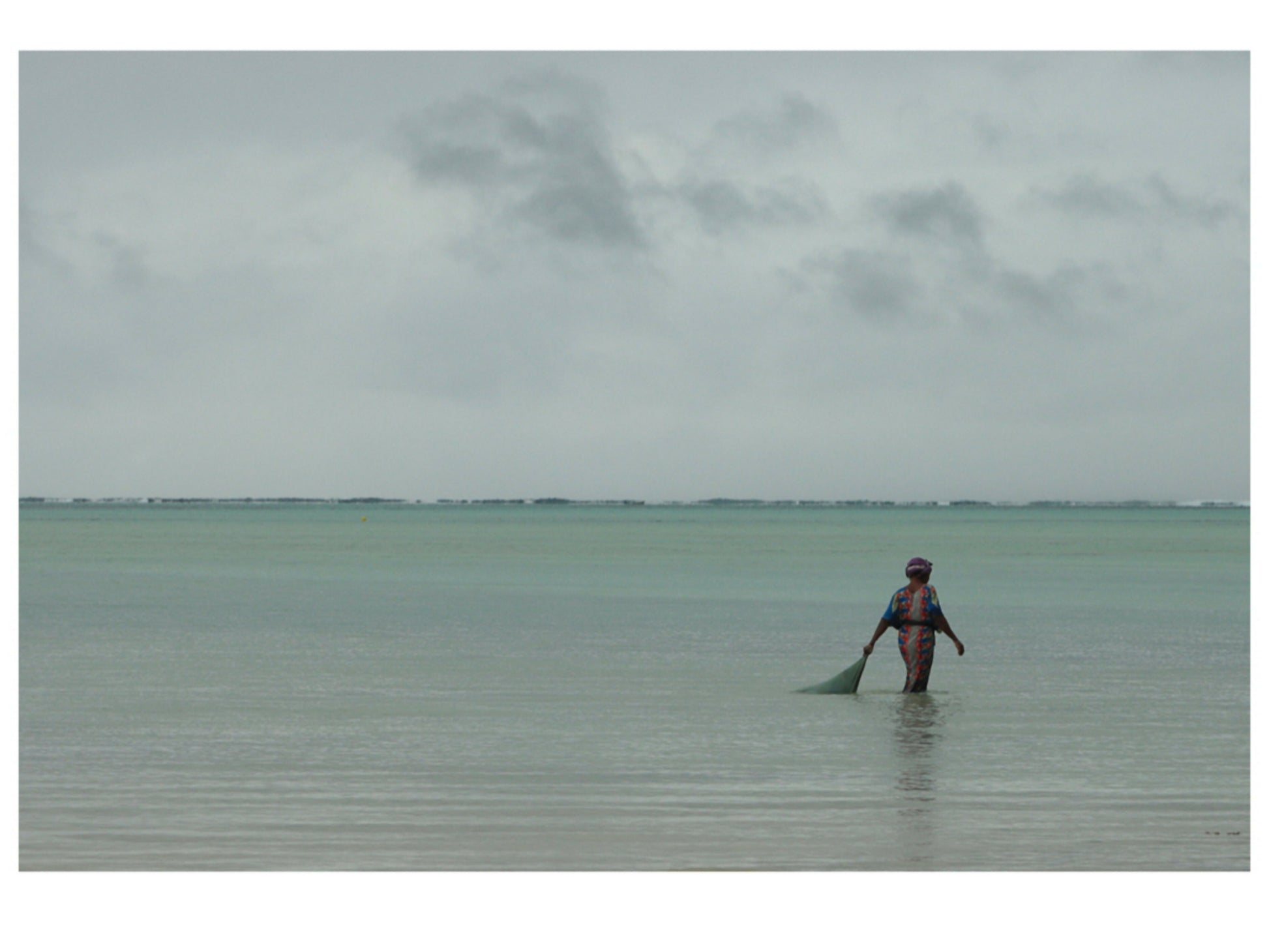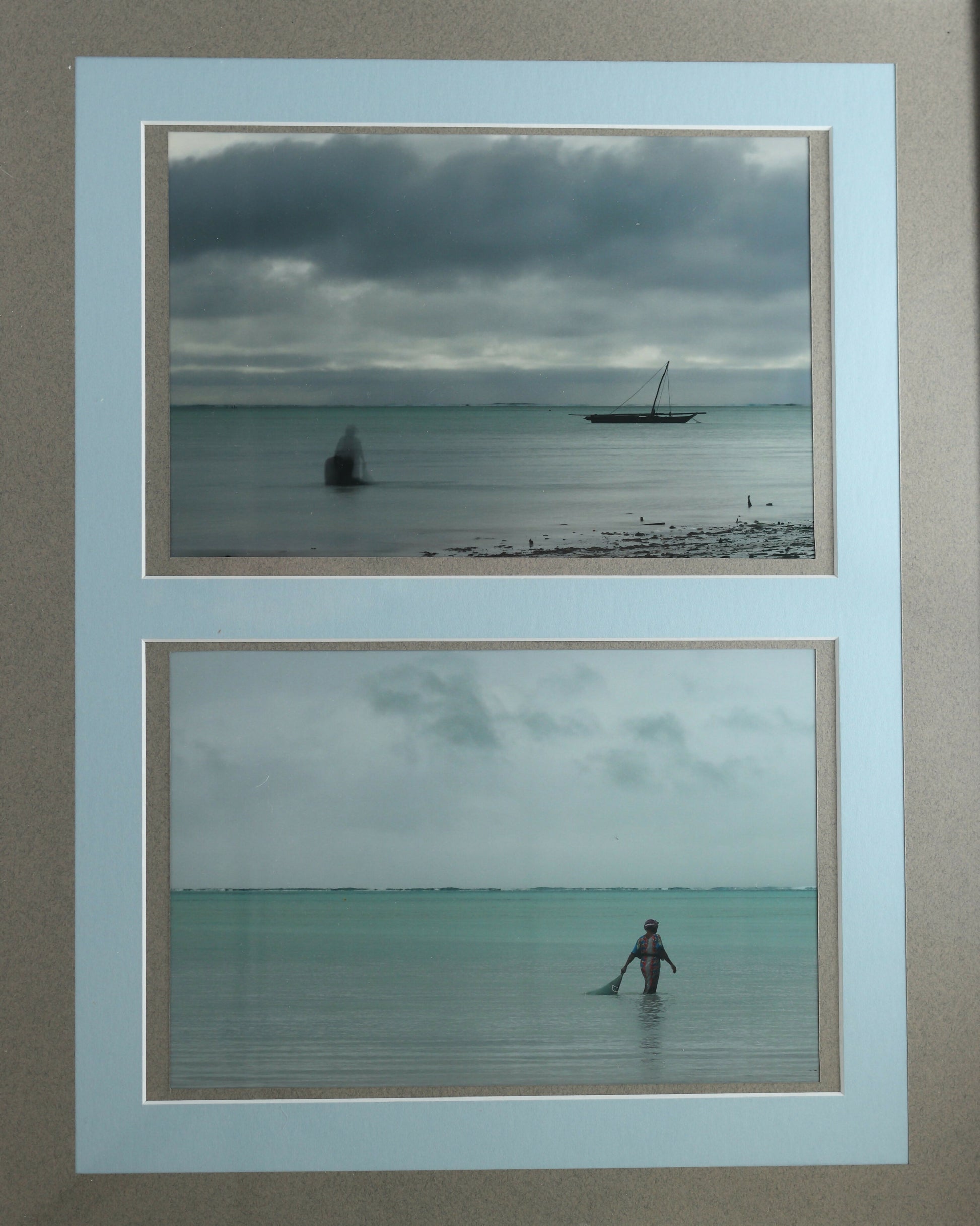 two images, two women seaweed farmers of Paje, Zanzibar, as they wade, early in the morning, in the Indian Ocean to harvest their crop.