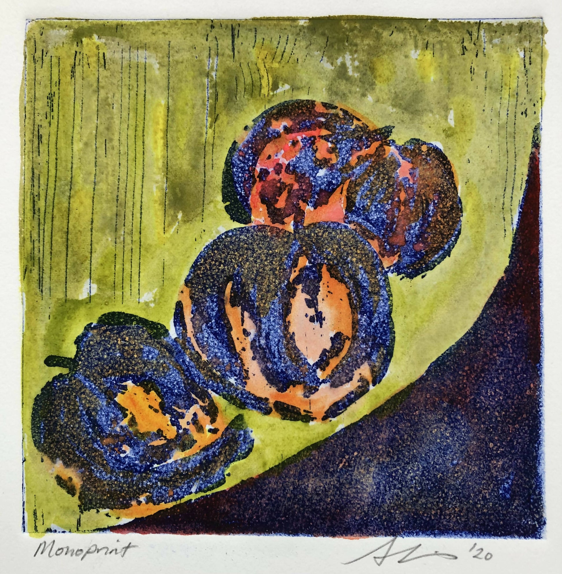 This is a one of a kind hand colored etching monoprint. It is a bowl of peaches. print is 6"x6" matted unframed 12.5"x12.5"