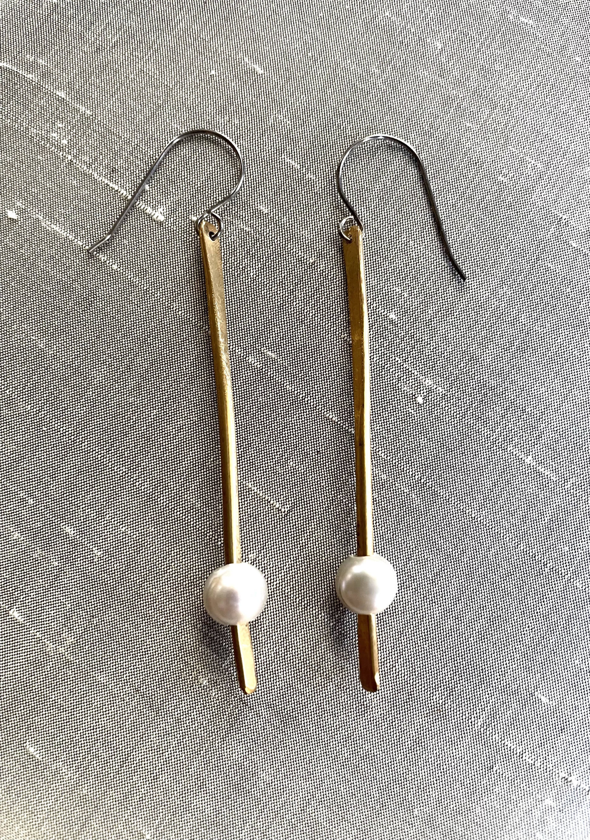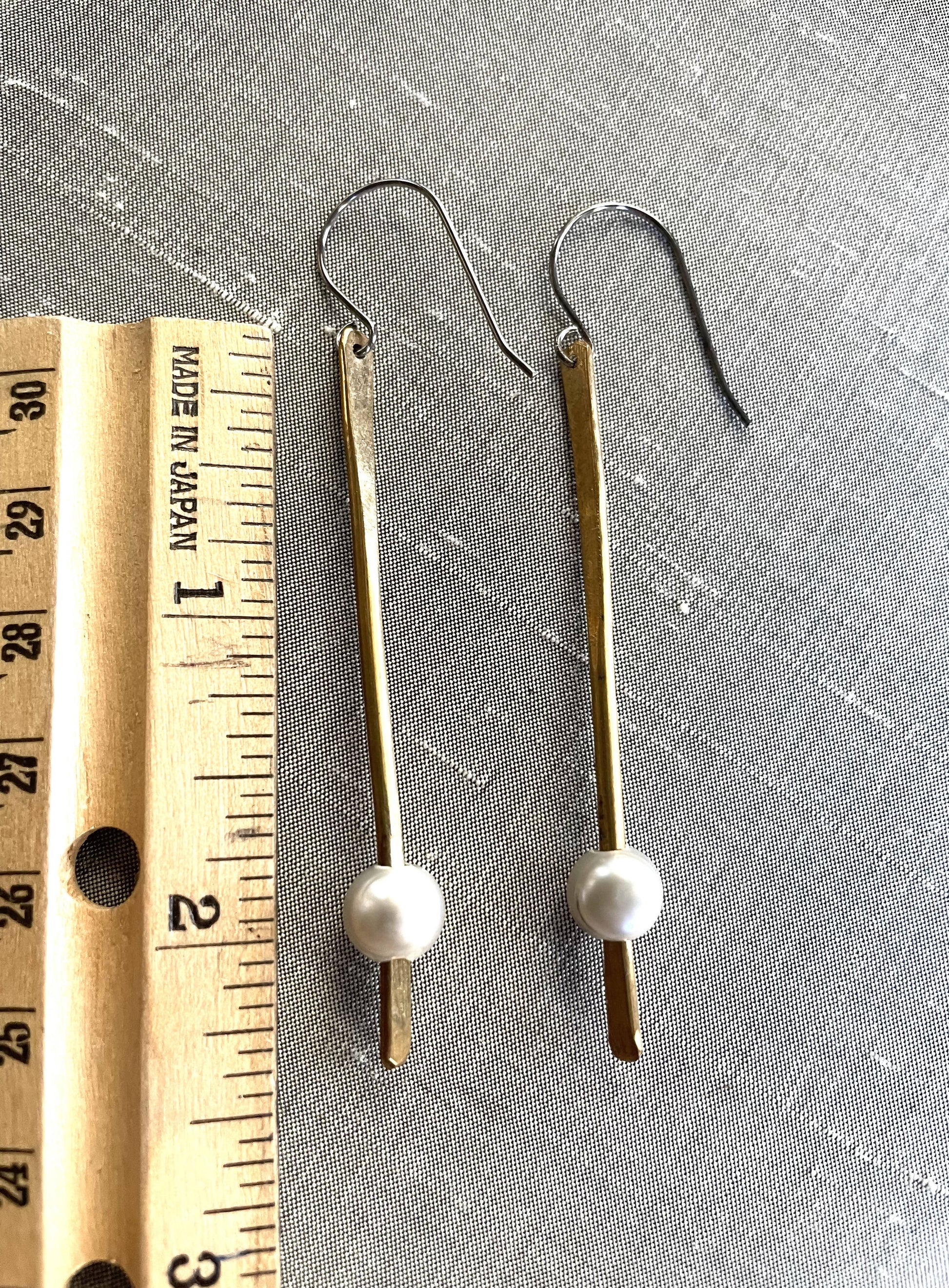 Minimal brass and pearls earrings. On sterling silver rodium plated earwires.