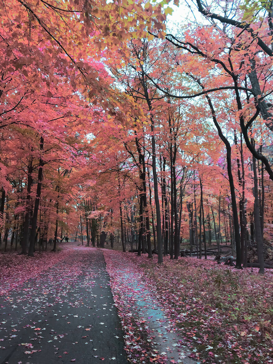 Photograph of a couple holding hands at end of a path brimming with pink and orange leaves, from a local forest preserve in fall.
