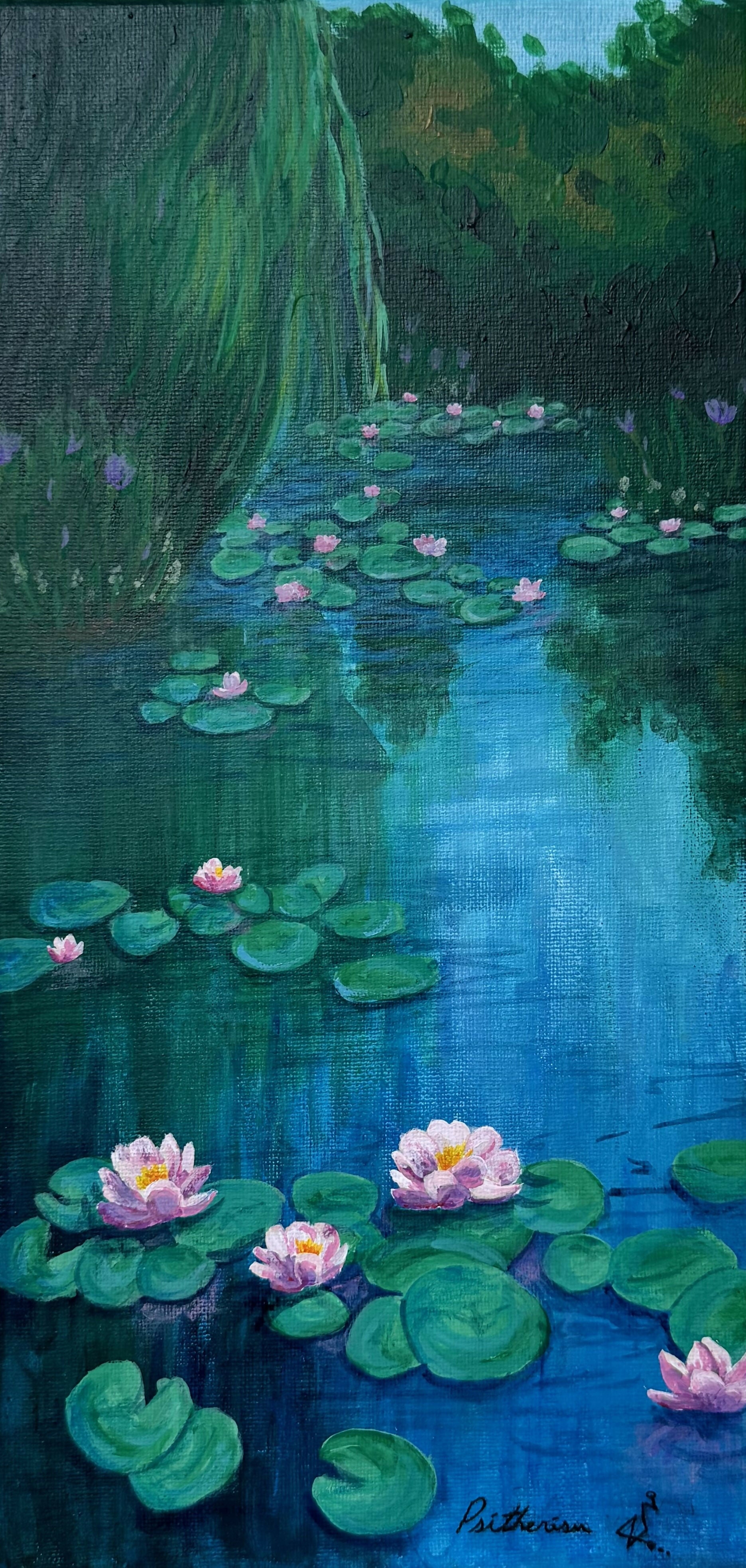 Print of Acrylic painting of water lilies at the Monet's Garden in France.