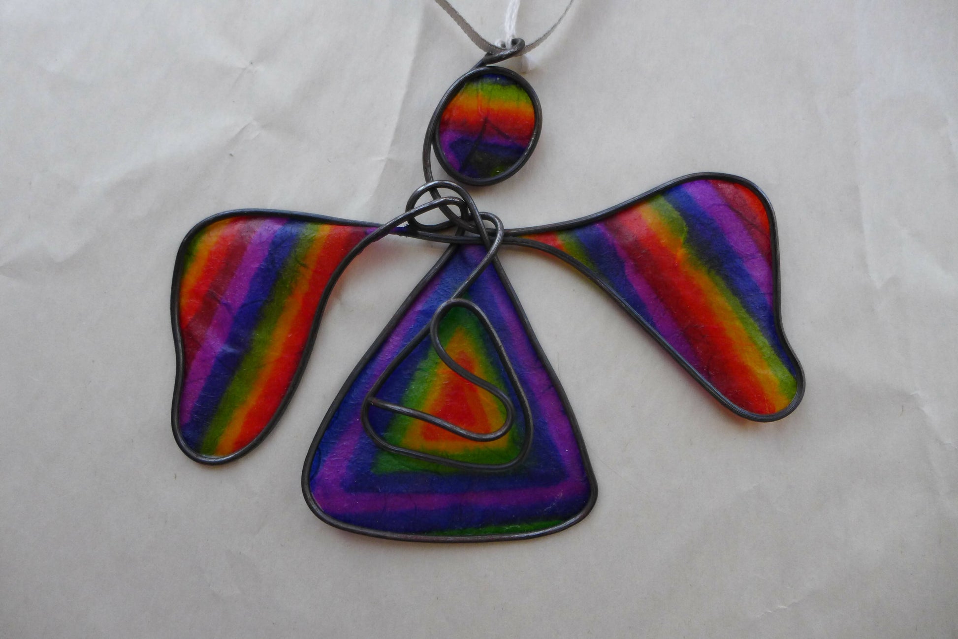 Rainbow Angel Ornament, markers on tissue paper with encaustic and wire