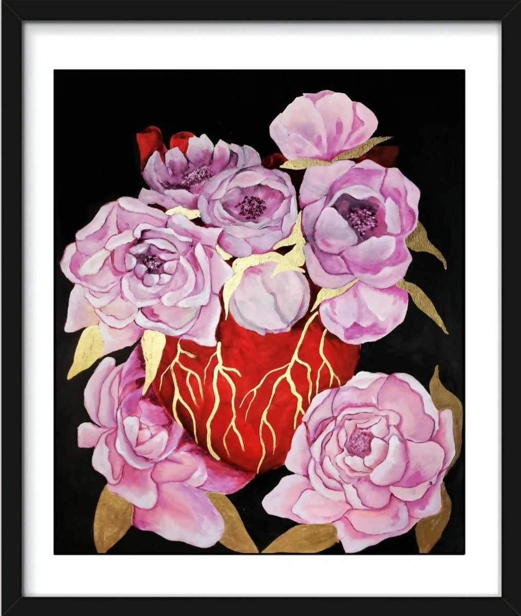Heart presented in rose peonies that represents motherhood. And golden leaves as new life.