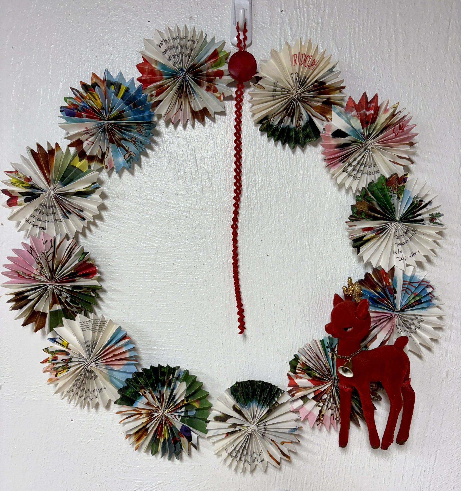 My whimsical Rudolph wreath is created from a retired Golden Book in its entirety - each page is folded and trimmed into a magical snowflake and affixed to an upcycled metal ring, tied up with zig zagging rick rack adorned with a red vintage button to echo Rudolph’s shiny nose. Perched atop the wreath sits a very vintage red velvet flocked Reindeer with glittery gold horns and a magic little bell necklace. This wreath is one of a kind, for indoors only, and is 17”x17”. I used all recycled upcycled and sustainable materials.