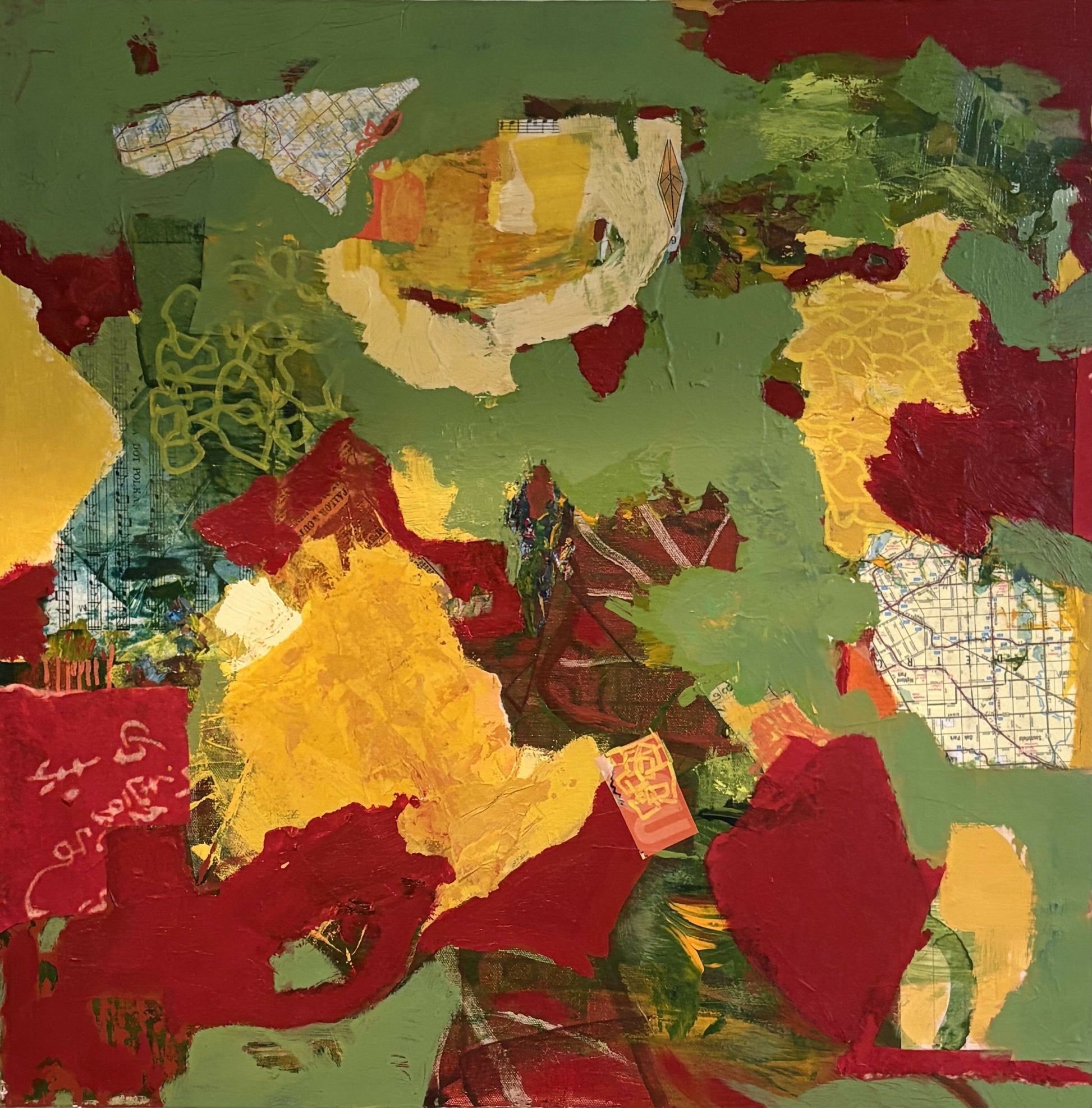 I started incorporating pieces of maps into many of my paintings when I found a road map in my father in law's car with directions to my parent's house, handwritten by my late mother in law. That triggered a wave of sentimentality and a desire to imbed map pieces into my paintings. The maps also symbolize my love of travel, searching out new places, which in turn create new emotions and ways of seeing things.