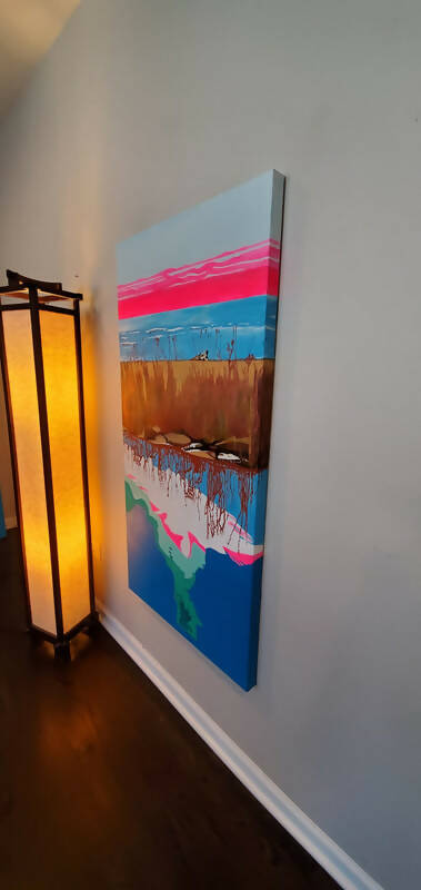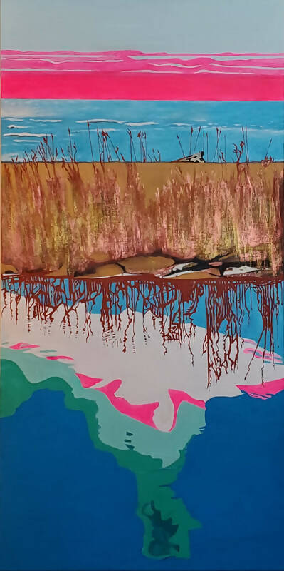 Acrylic, Gallery Wrap, Painting from Evanston on the Northwestern University campus, overlooking Lake Michigan, with reeds and clouds reflected in the gulf.