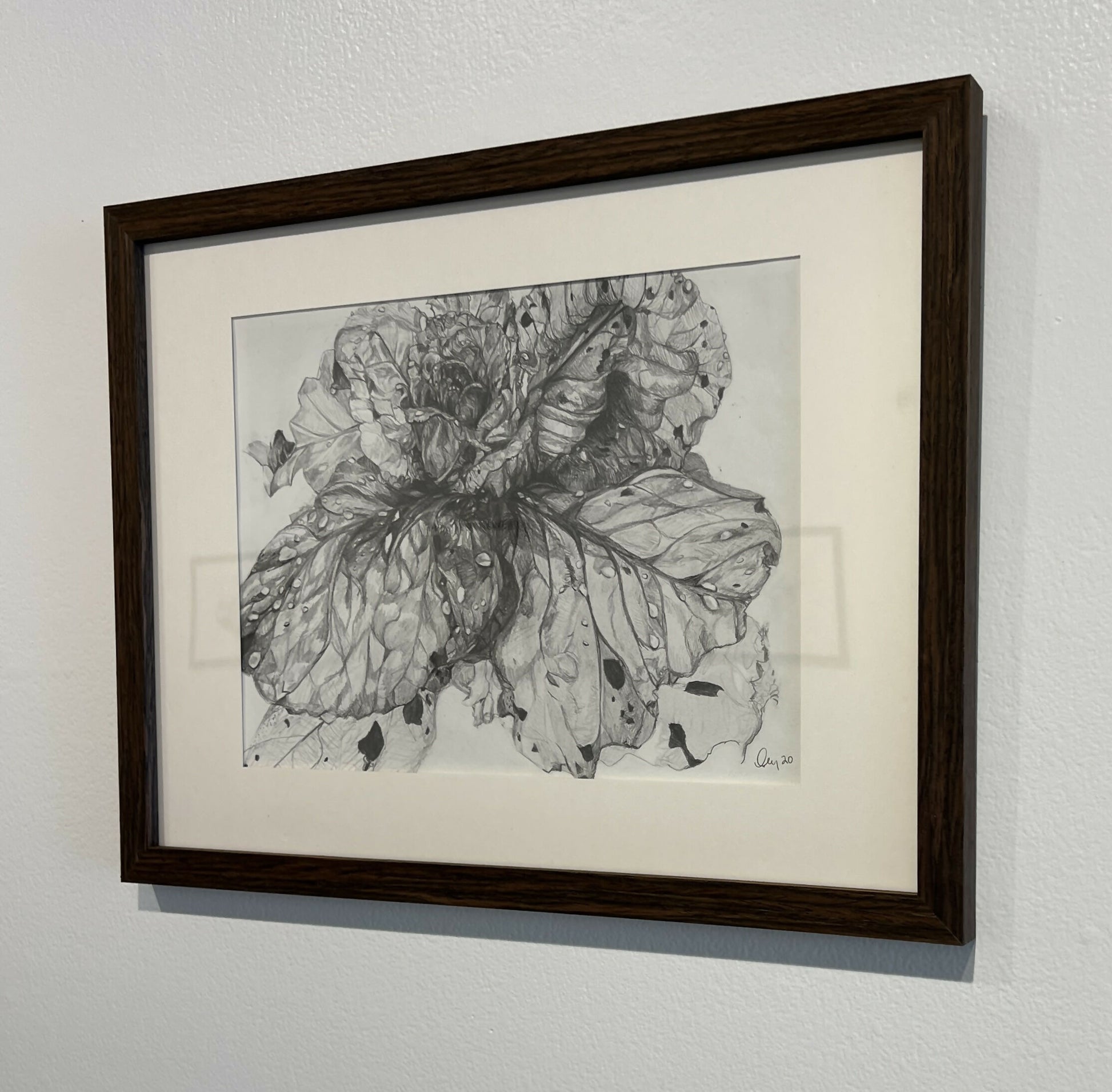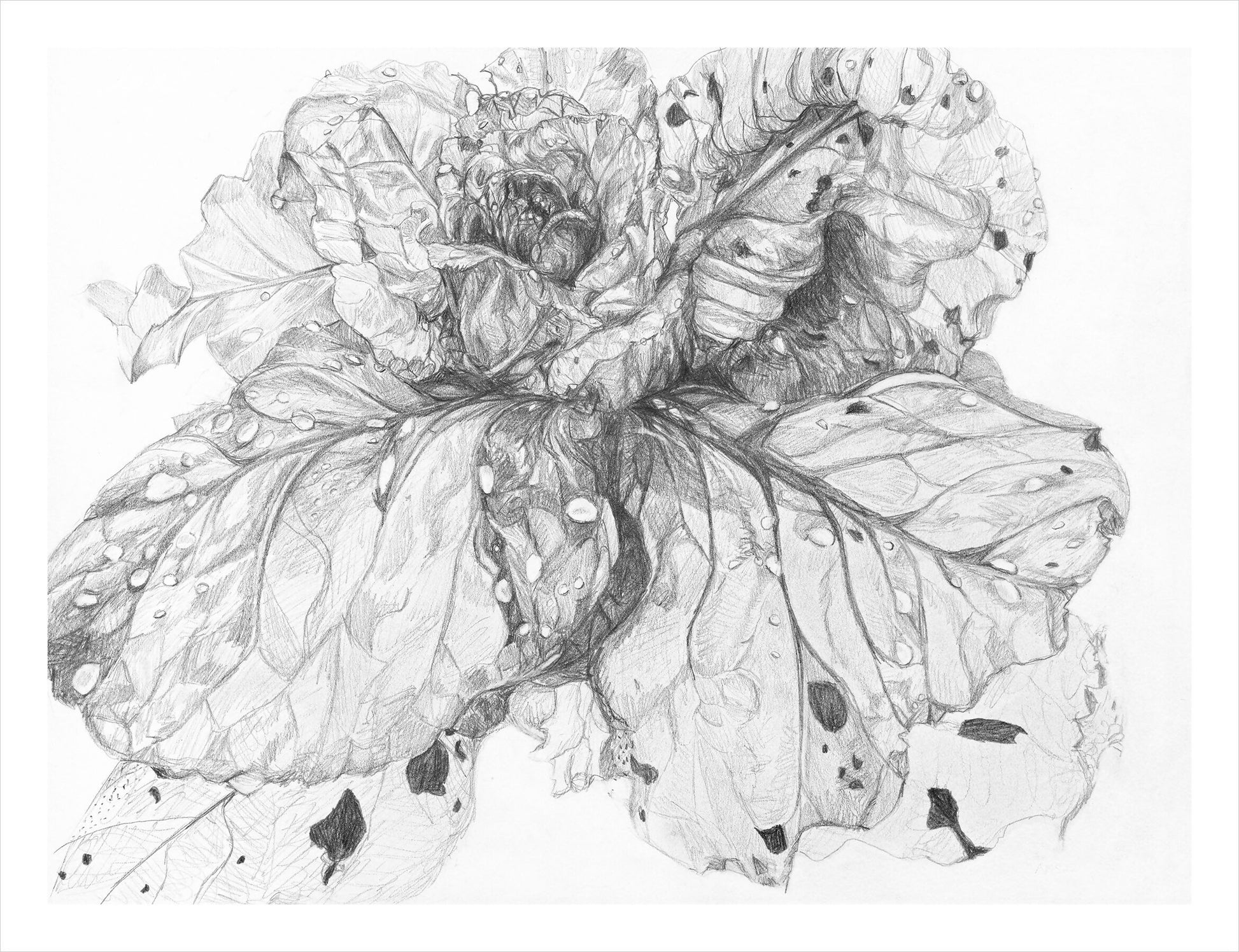 Beautifully detailed pencil drawing of a rain and insect eaten giant cabbage plant growing, it's strength shining through. Undulating darks and lights capture the crystal drops standing on leaves left from a nourishing rainstorm. Drawn at Wagner Farms, part of a series investigating the growth and symbiotic nature of vegetables and their antagonists, created in the community garden during the summer of 2020. 12"x 9" brown wood framed original, as well as framed and unframed archival prints available.