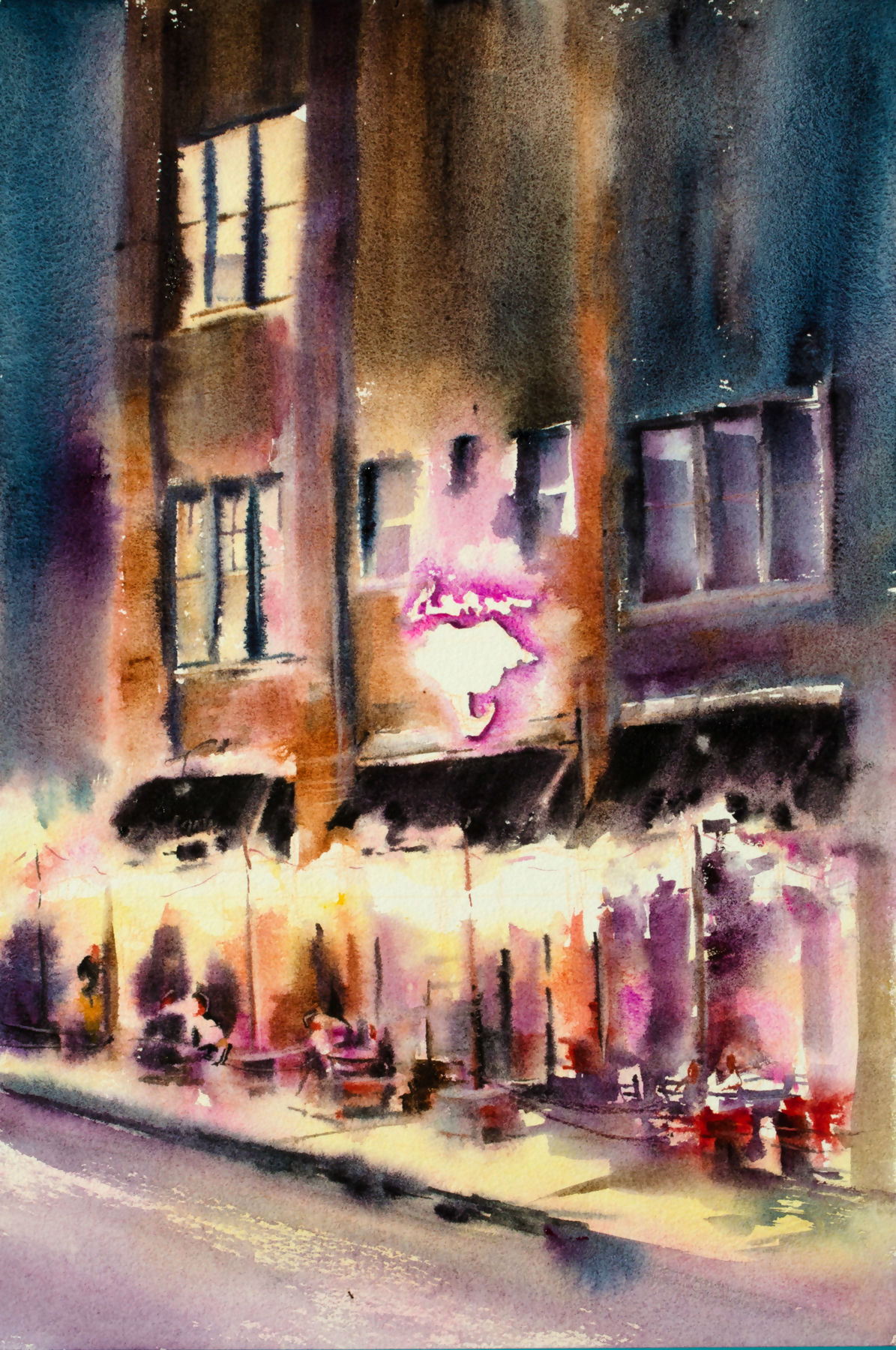 I couldn’t wait to paint this vibrant, nocturne scene on Chicago Avenue. The twinkly lights and the vivid violets and purples just jumped out of the night sky. 22" x 15"