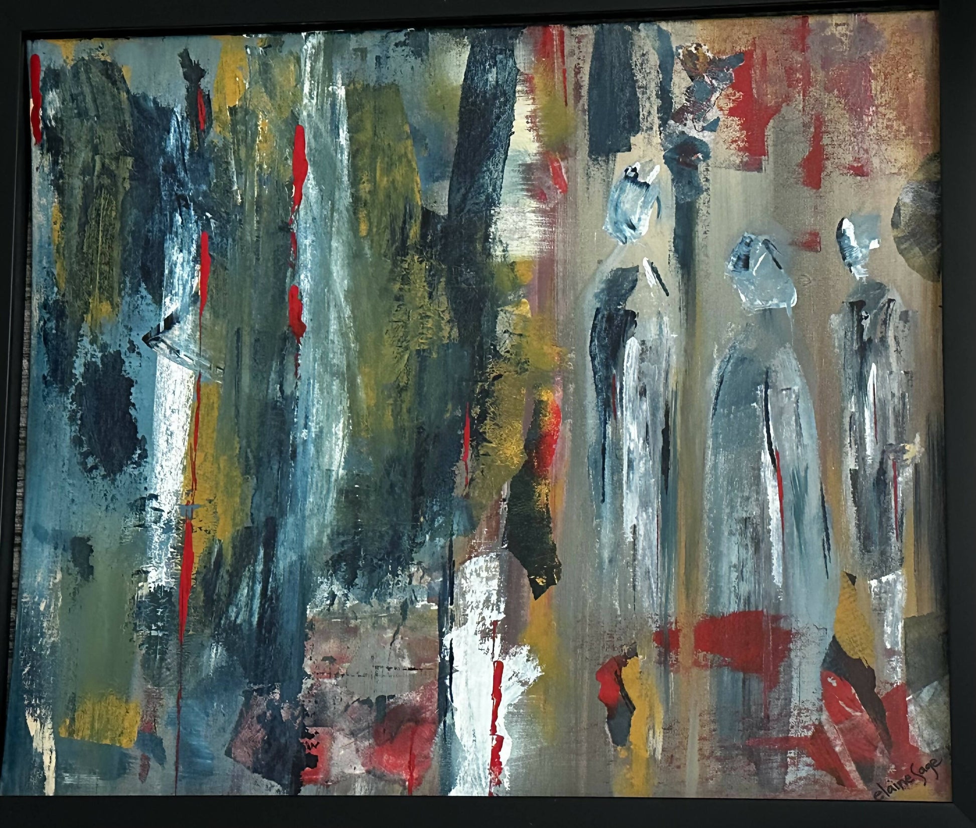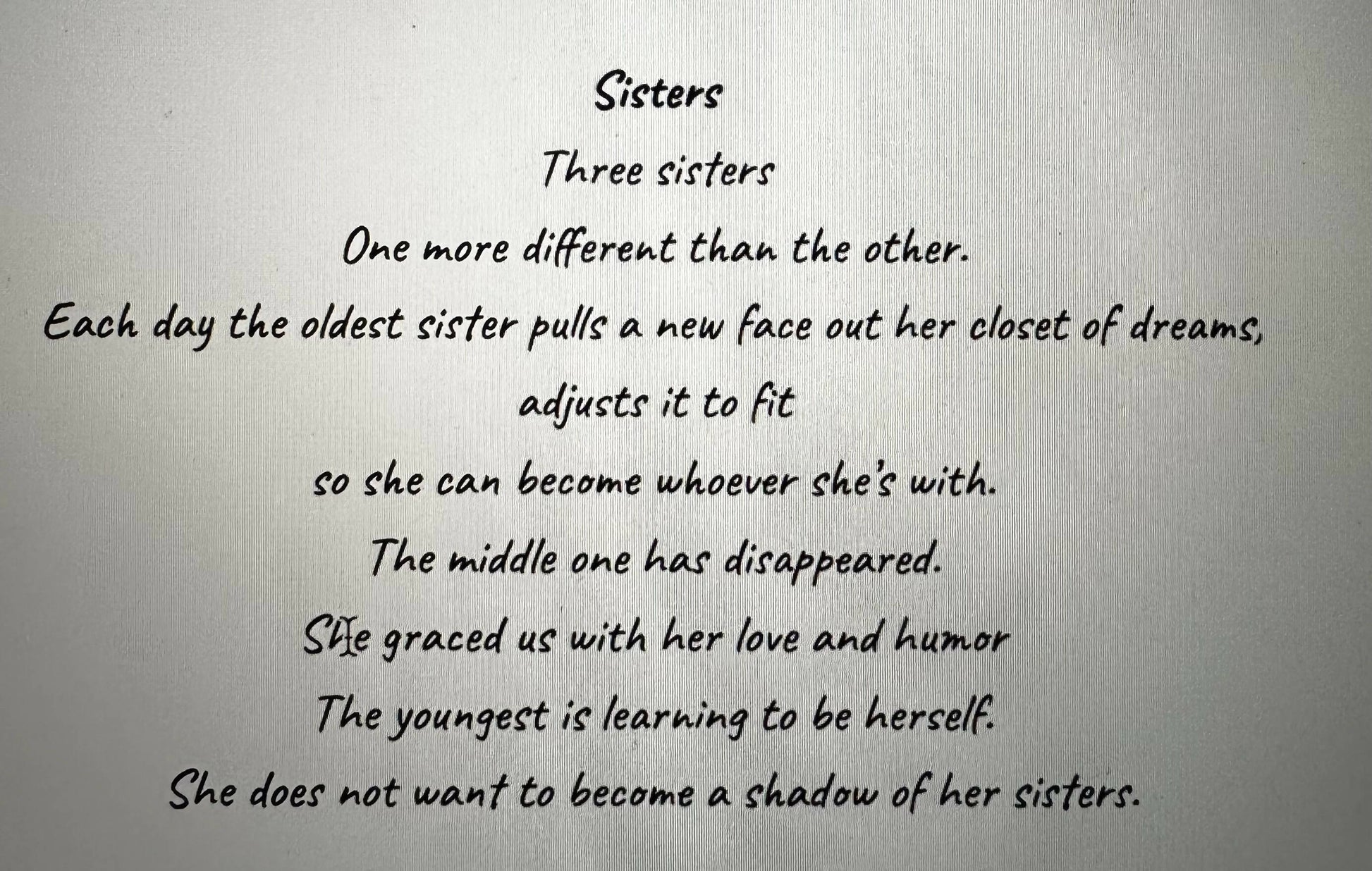 This painting shows images of three figures. I call them sisters. A poem about sisters is included.