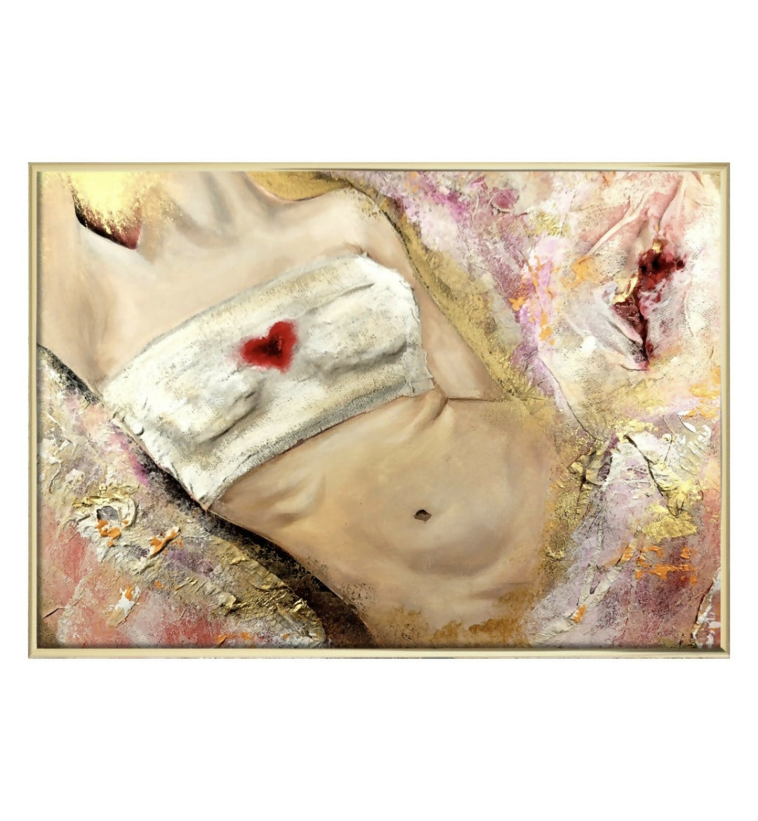 "Still healing" is a piece that represents wrapped woman torso in bandages, her chest bears a heart-shaped mark, a visual echo of pain and healing. This mixed media work reflects the first fragile moments after suffering.