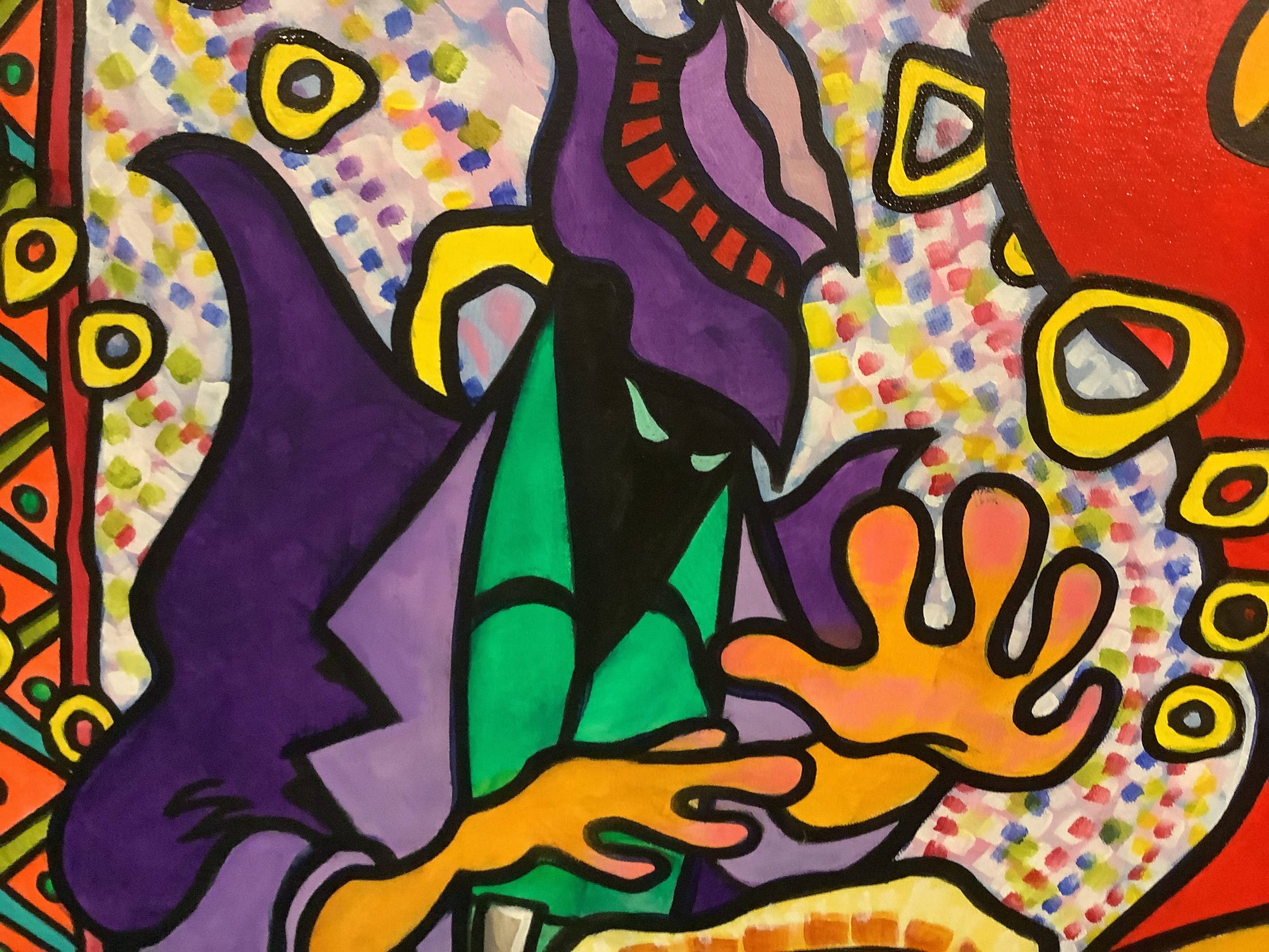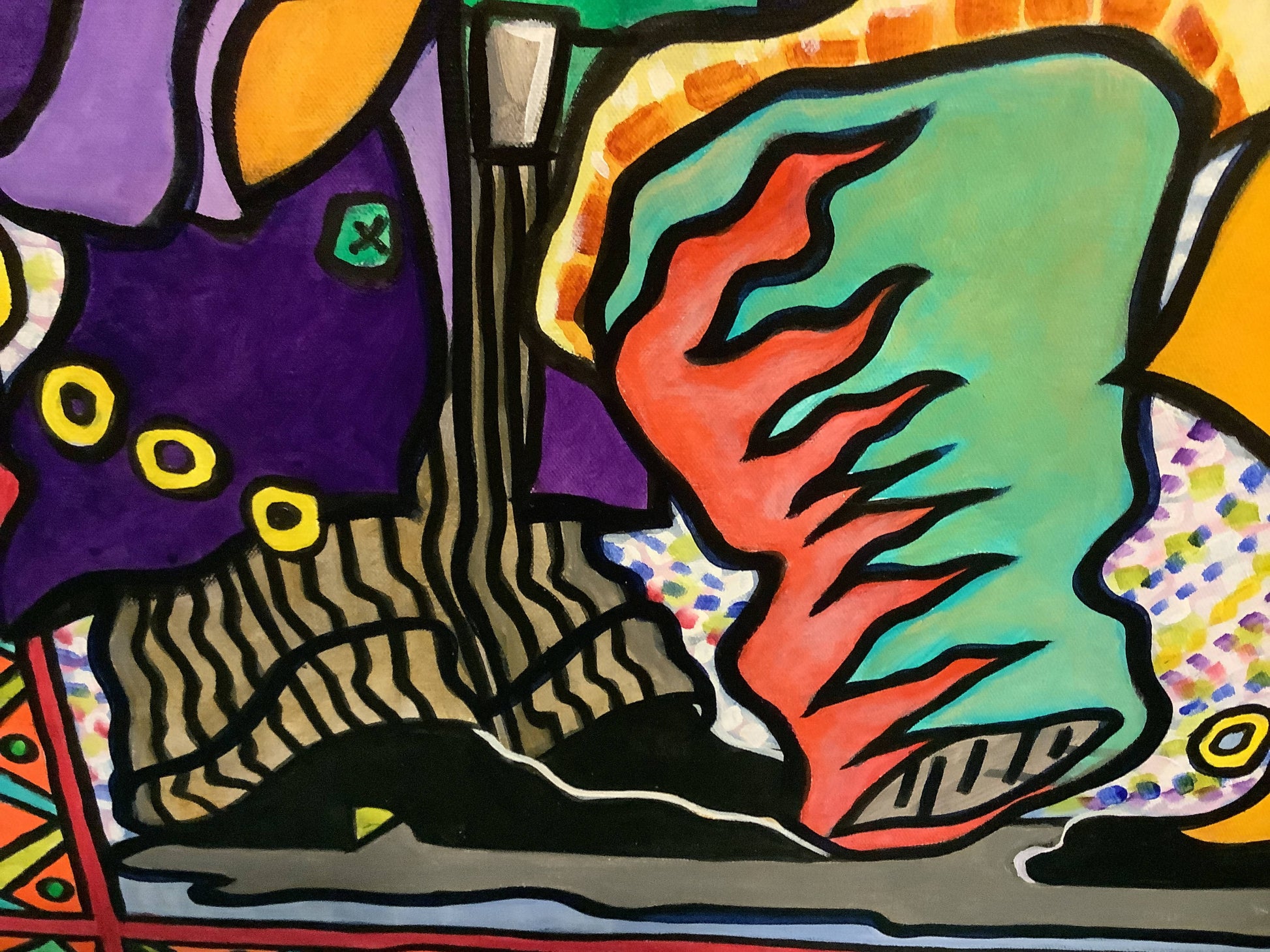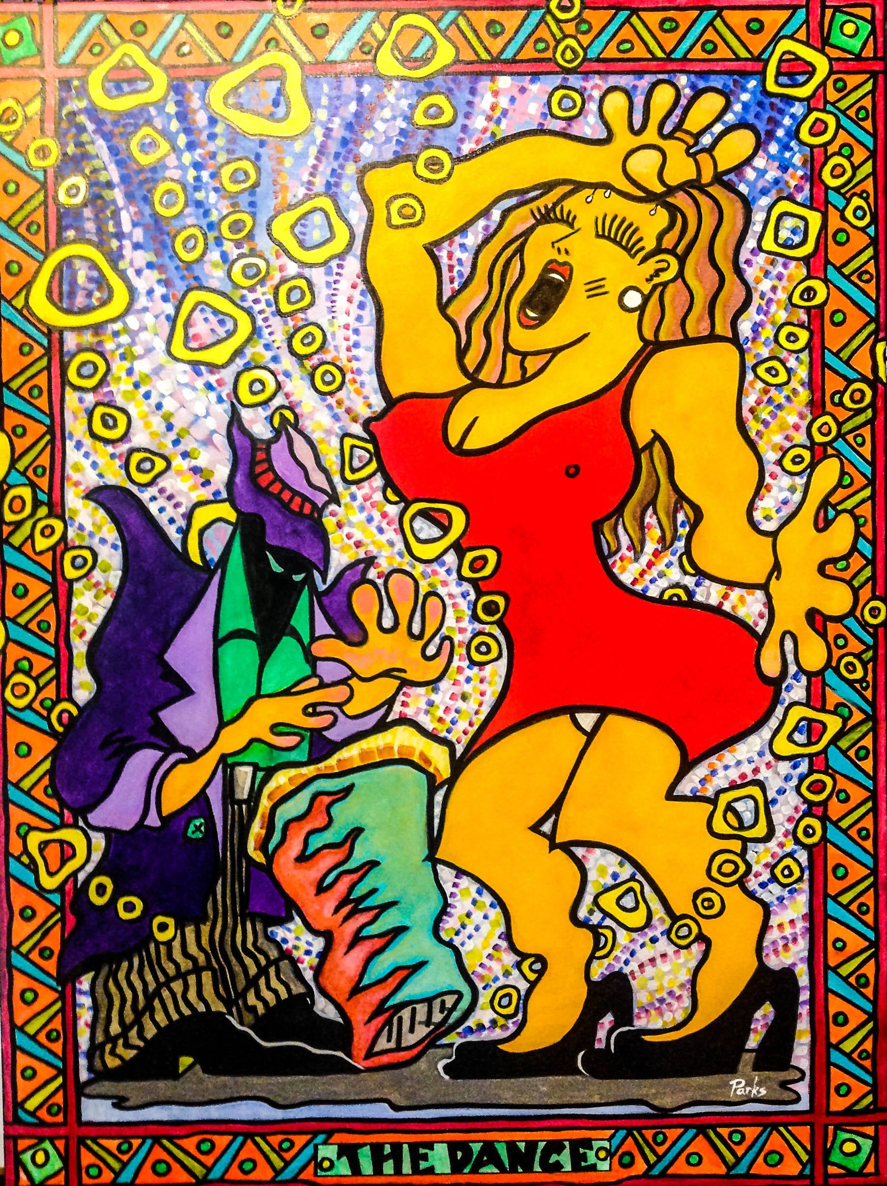 Talk about action! Here is today's version of the time-honored tradition of male drumming and female dancing. The drummer drives the rhythm and the dancer responds. The more the dancer dances, the more the drummer drums, and these two are workin' up a storm! Durable acrylic paint on a big 40" x 30" canvas. Big splashes of primary colors to enliven any room.