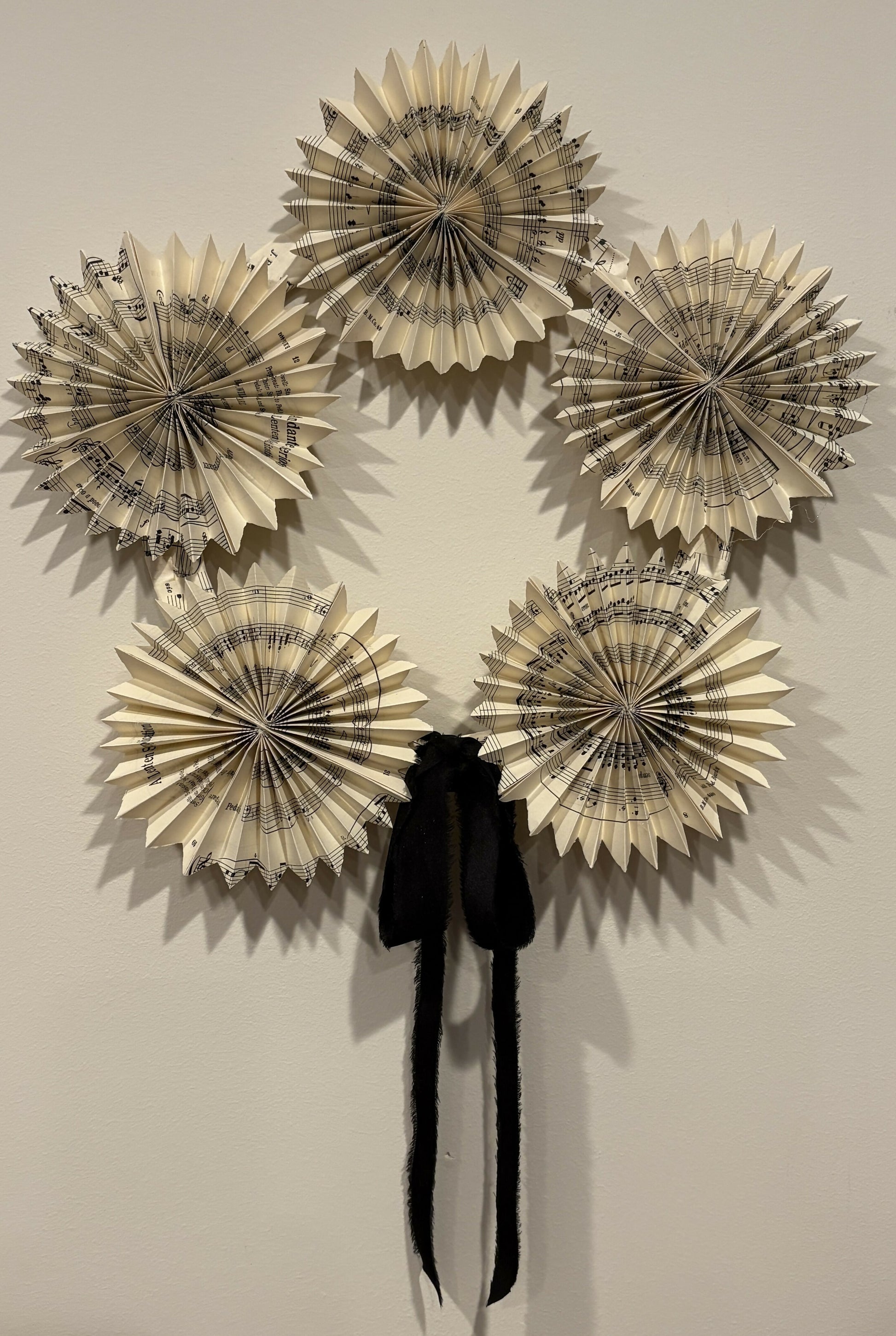 Reminiscent of Ruth Bader Ginsberg’s iconic dissent collars, I created this sweet wreath using antique JS Bach sheet music folded and trimmed into magical snowflakes attached to an upcycled paper wrapped metal ring, and finished her off elegantly with a black chiffon bow. She’s so fine! This lovely piece is a meant for indoors and can be used as holiday decor or throughout the year and is completely made of recycled upcycled and sustainable materials. 15” x 15”.