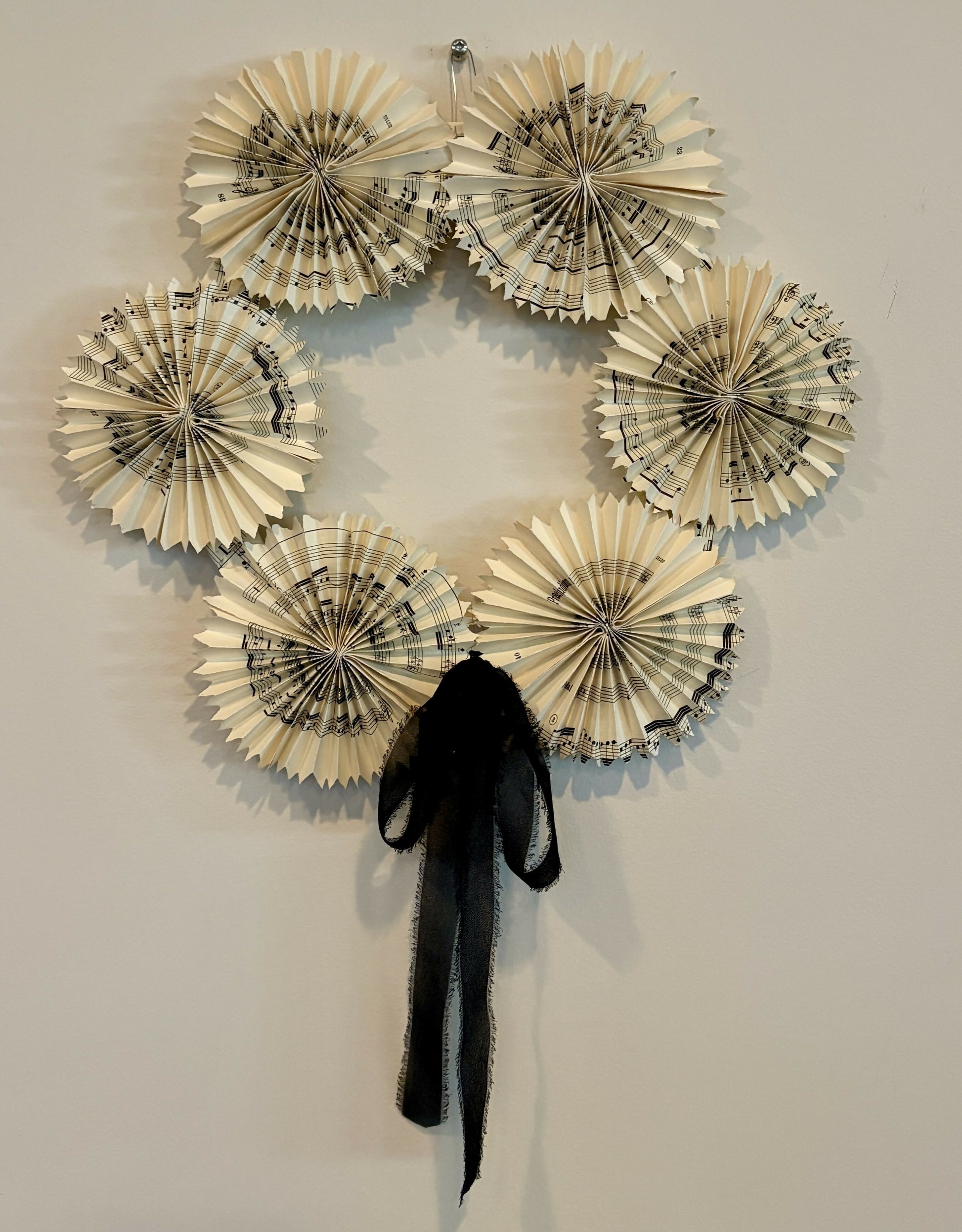 Reminiscent of Ruth Bader Ginsberg’s iconic dissent collars, I created this sweet wreath using antique JS Bach sheet music folded and trimmed into magical snowflakes attached to an upcycled paper wrapped metal ring, and finished her off elegantly with a black chiffon bow. She’s so fine! This lovely piece is a meant for indoors and can be used as holiday decor or throughout the year and is completely made of recycled upcycled and sustainable materials. 15” x 15”.