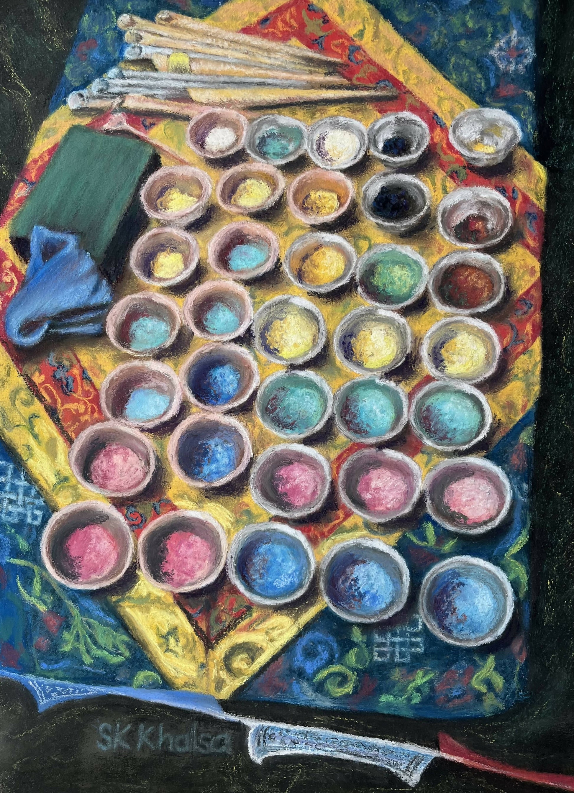 Soft Pastel Painting on Sanded Board; depicting the tools and bowls of colored sand used by Tibetan Buddhist monks for creating a sacred mandala. A team of monks will traditionally work together to build the mandala, which takes several days to weeks to complete. The destruction of the final mandala is highly ceremonial, where the sand is collected in a jar which is then wrapped in silk and transported to a river (or any place with moving water), where it is released back into nature, representing the impermanence of life, and to disperse the healing energies of the mandala to sentient beings in water and throughout the world. 11.5" x 16"