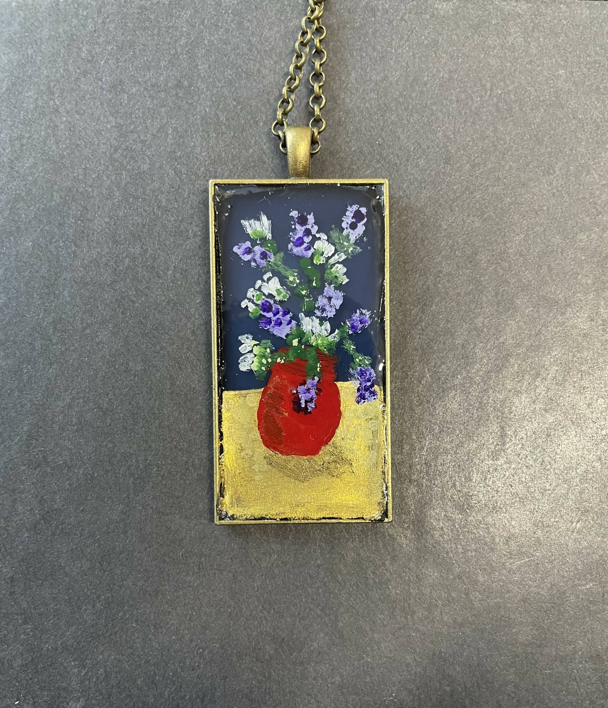 Rectangular, dark gold pendant with black background, red vase, gold table, purple flowers