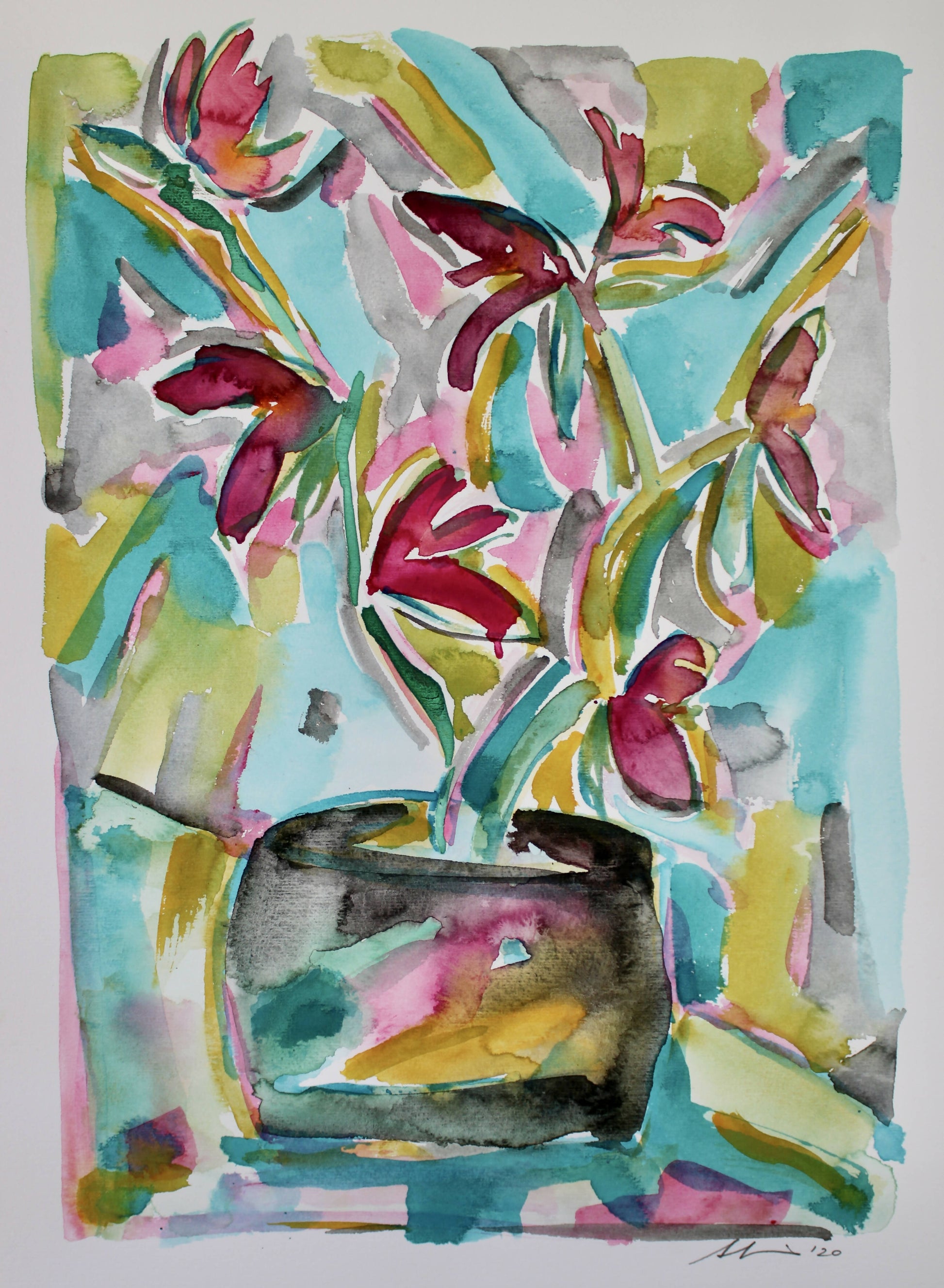 Original watercolor painting of tulips, semi abstract style 10"x14"