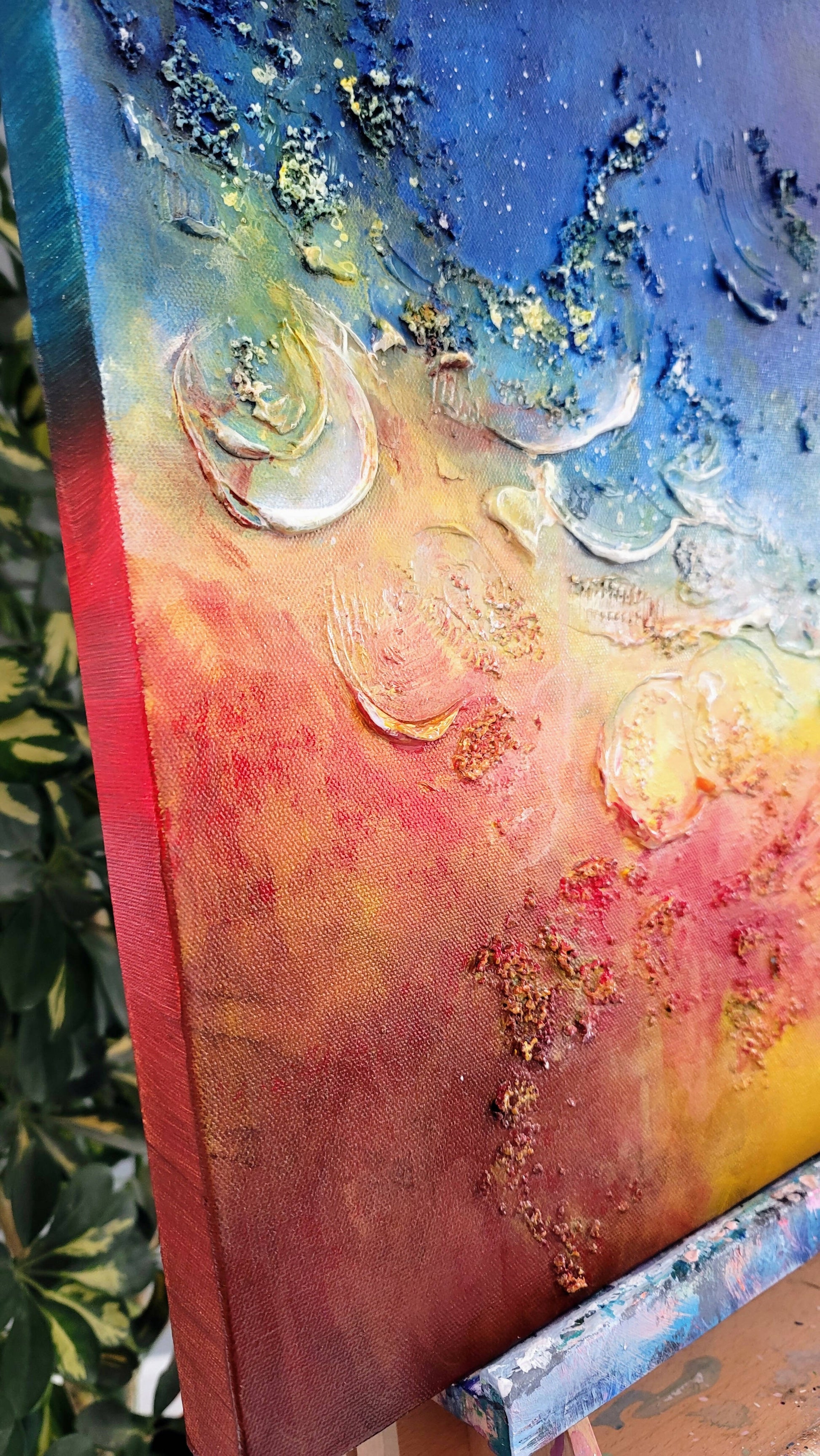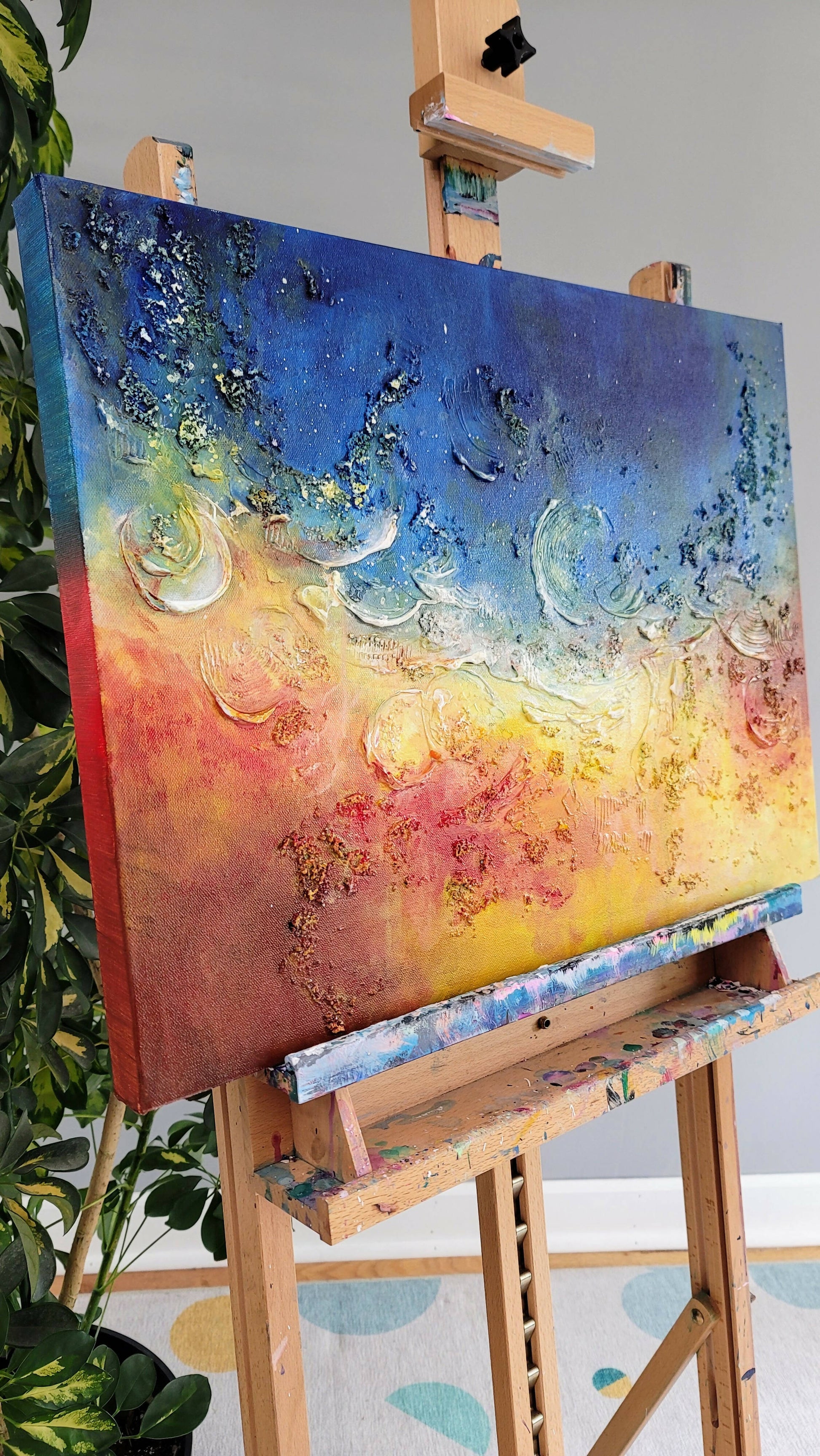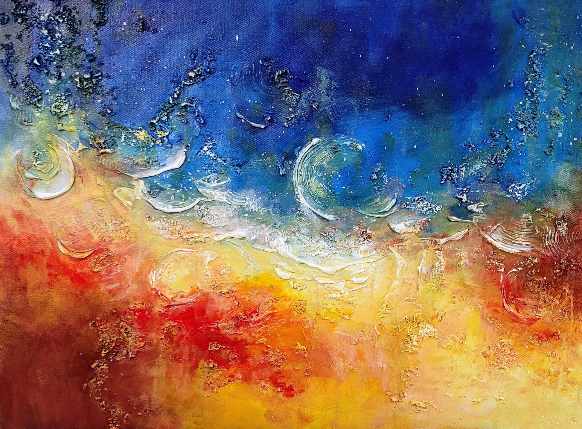 My inspiration for this piece was to find the balance between two worlds. I imagined water and fire coming together to create beauty. In the end, the painting reminded me of a beach, or another planet that is yet to be discovered.