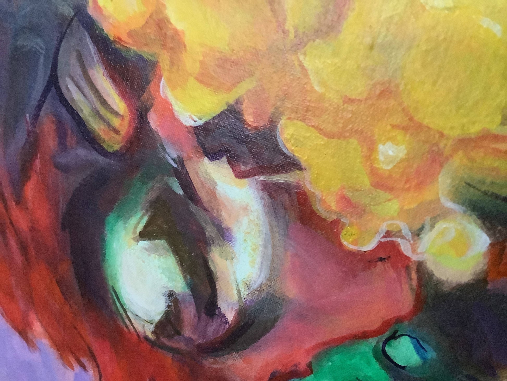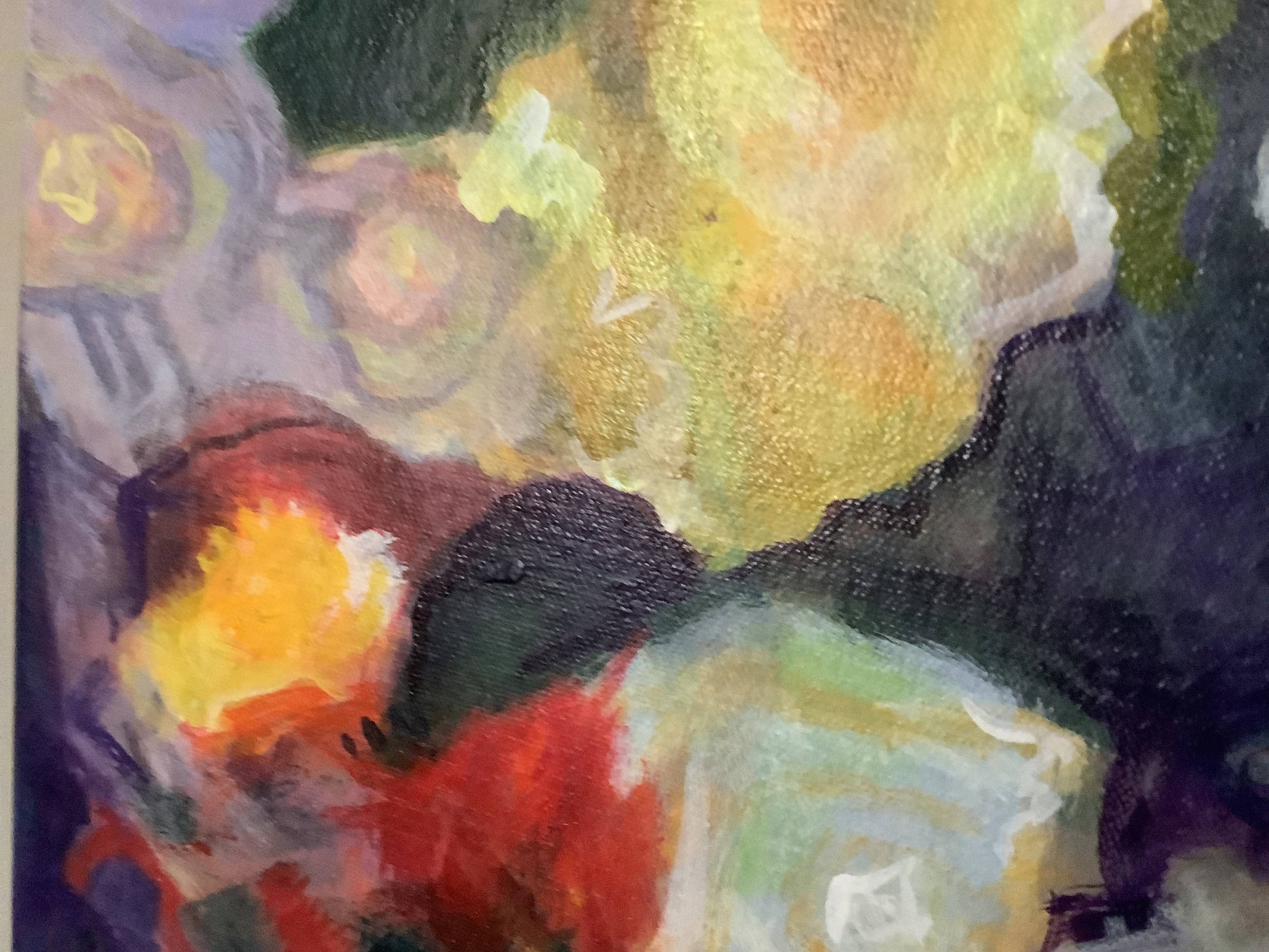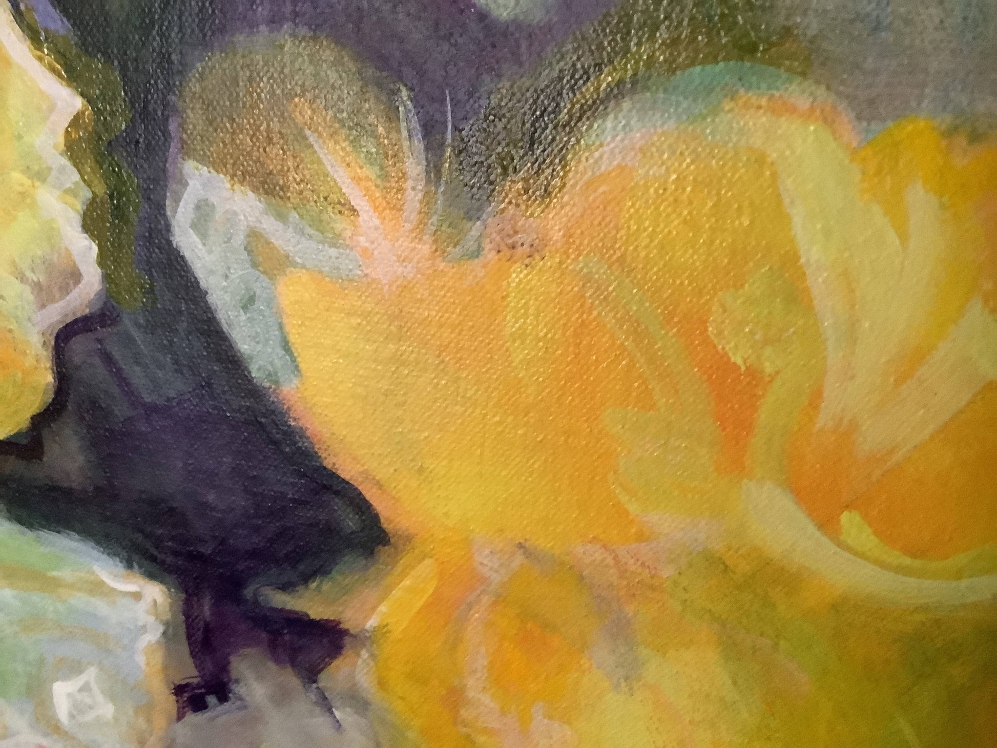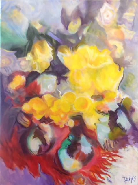 The noonday sun came streaming through the kitchen window, spotlighting the flowers and their little glass containers. I knew I had to capture the glowing yellows and oranges, set off by the crystalline blues and raging scarlets. This piece is durable acrylic paint on a 24" x 18" canvas. I'm delighted with the strong yellow flower, the cool blue glass vases, and the interplay between fuzzy patches of color and an occasional sharp outline.