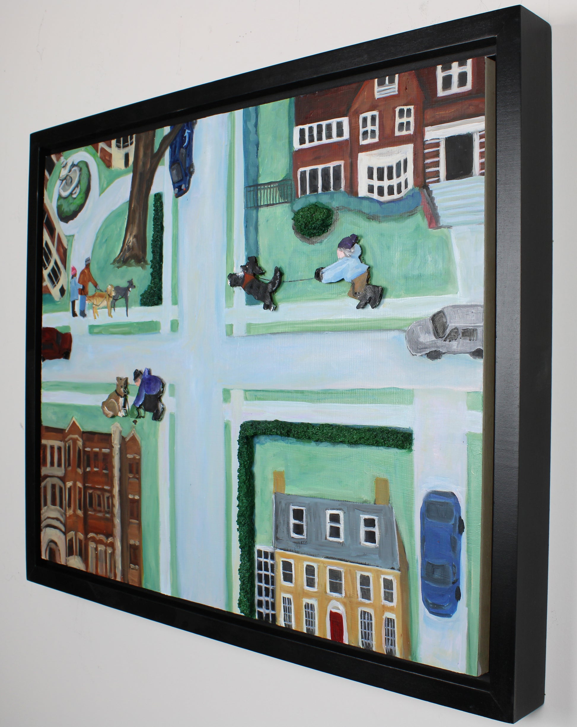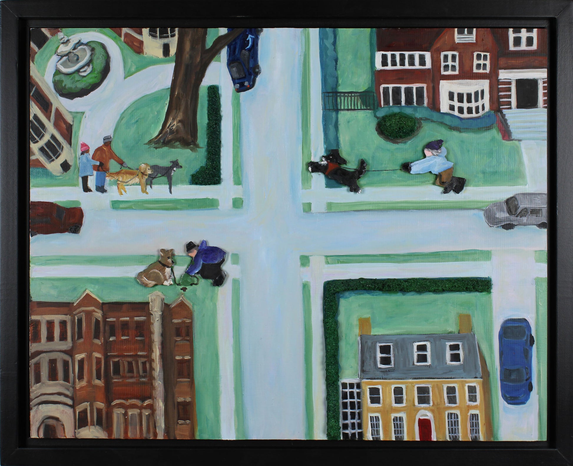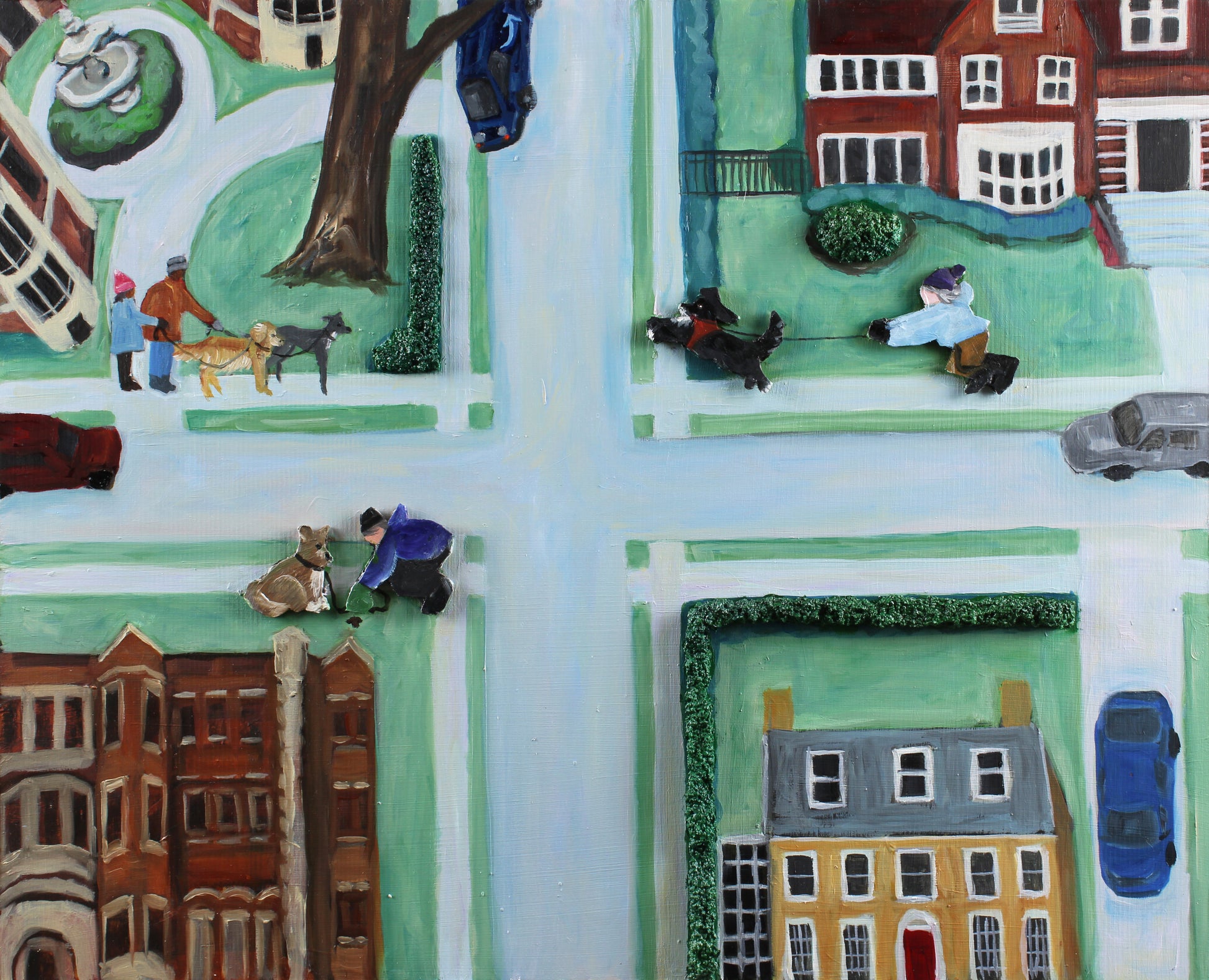 This was created during the pandemic, when the highlight of my day was walking my dog, Fiona. I live in a beautiful lively neighborhood that is a mix of vintage apartment buildings and century old gracious single family homes, as well as Lake Michigan 3 blocks away. This painting is a capture of my brain memory of the people and buildings I pass on a daily basis with certain elements built up with layers of cardboard.