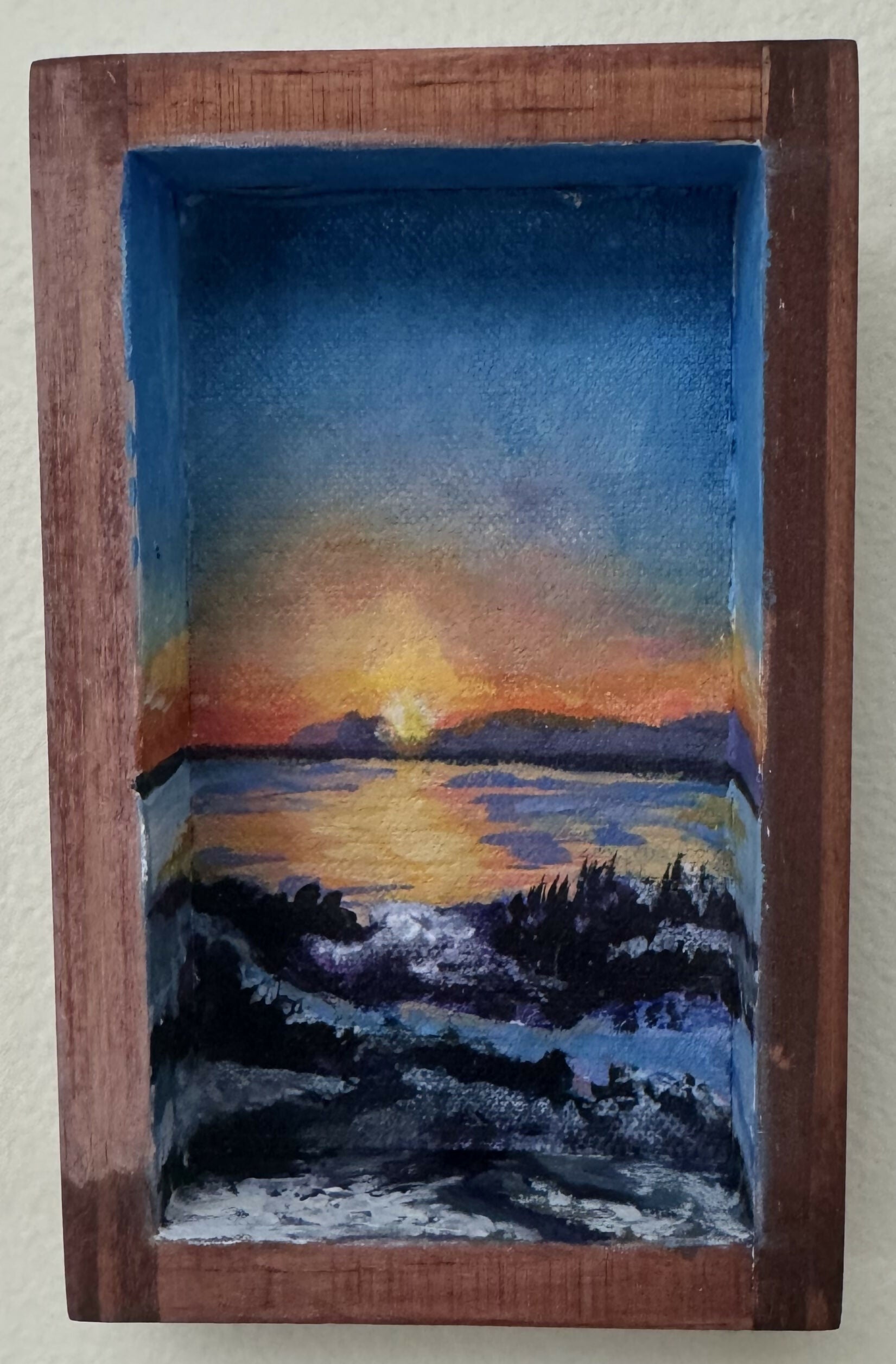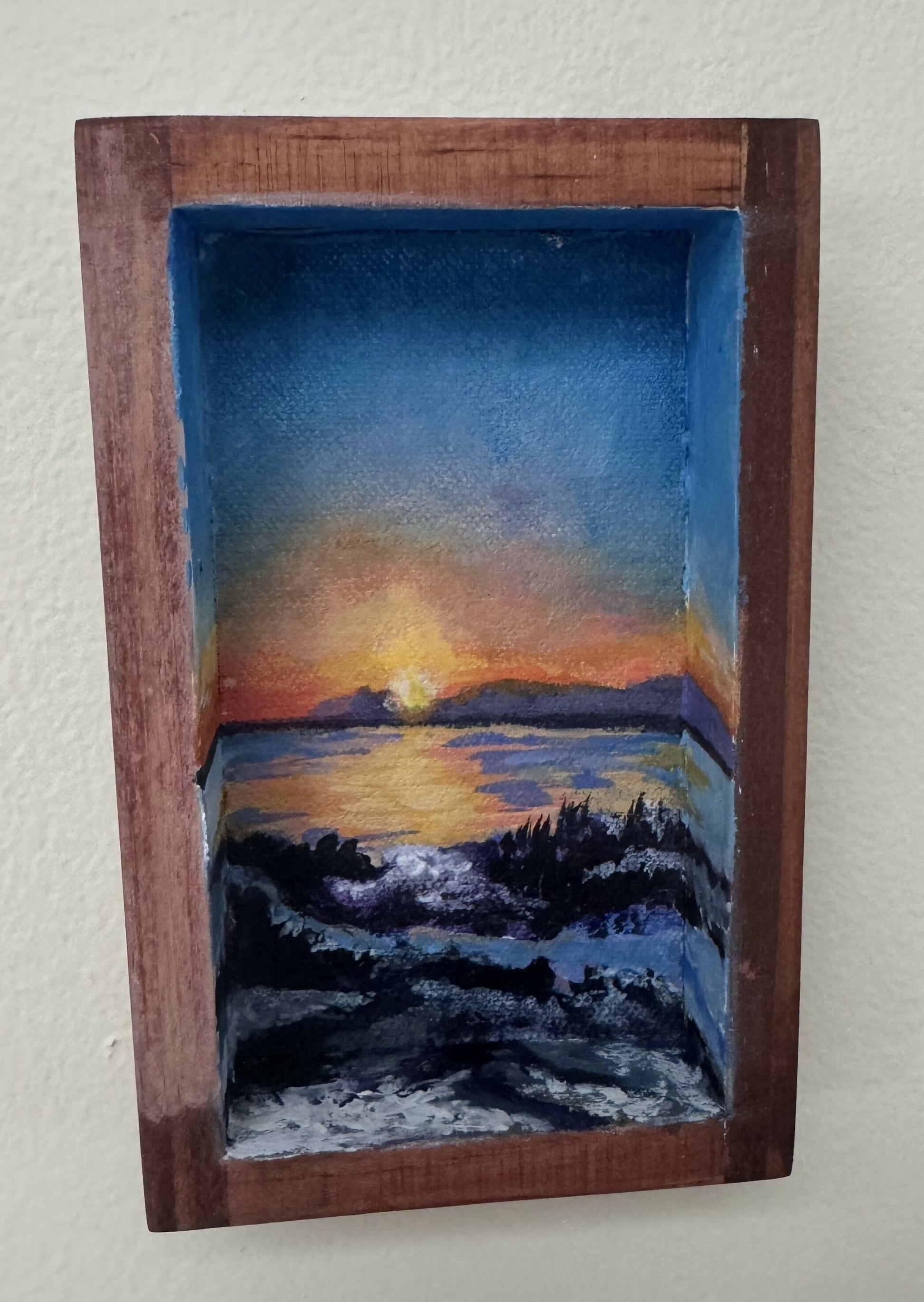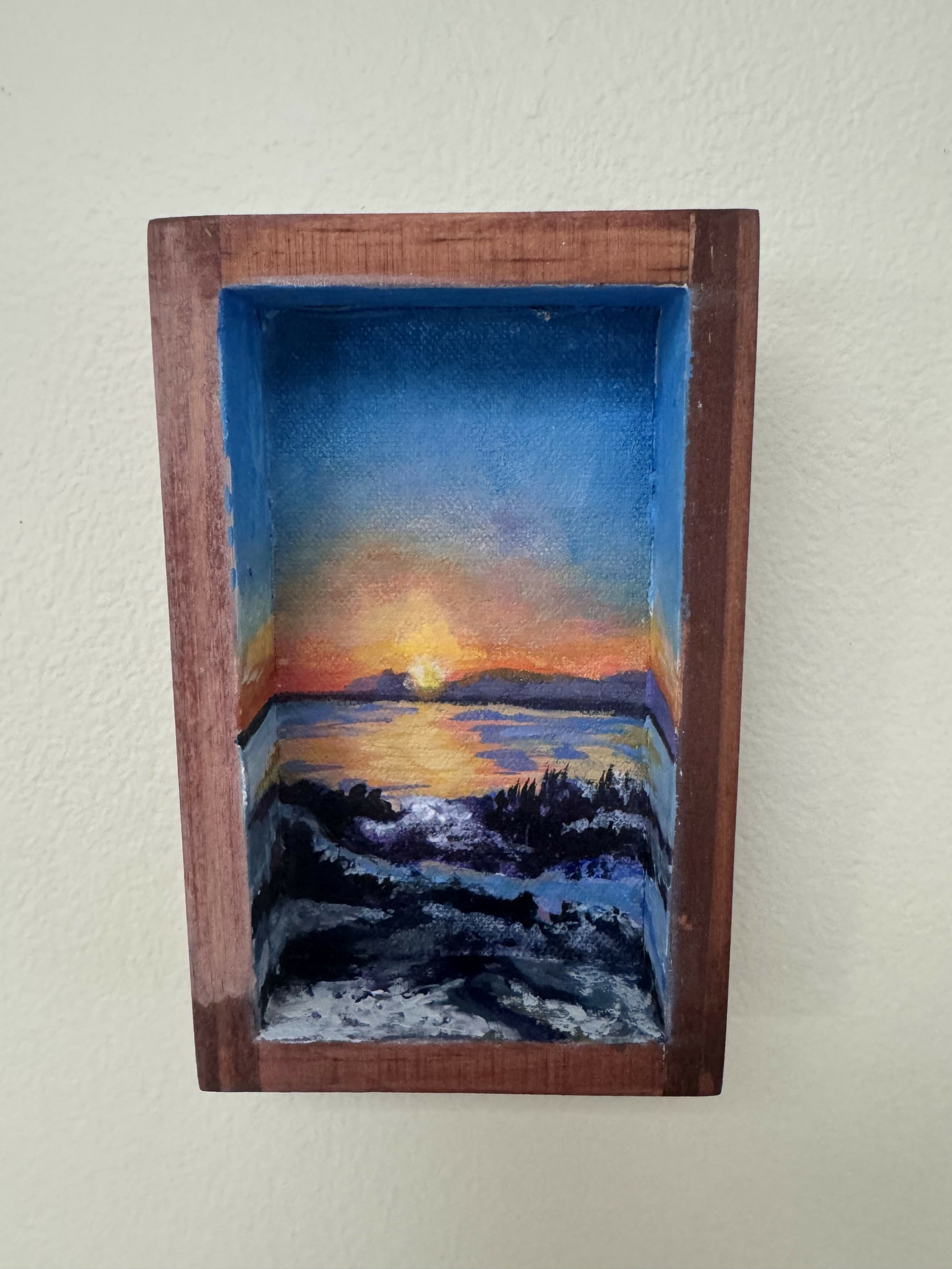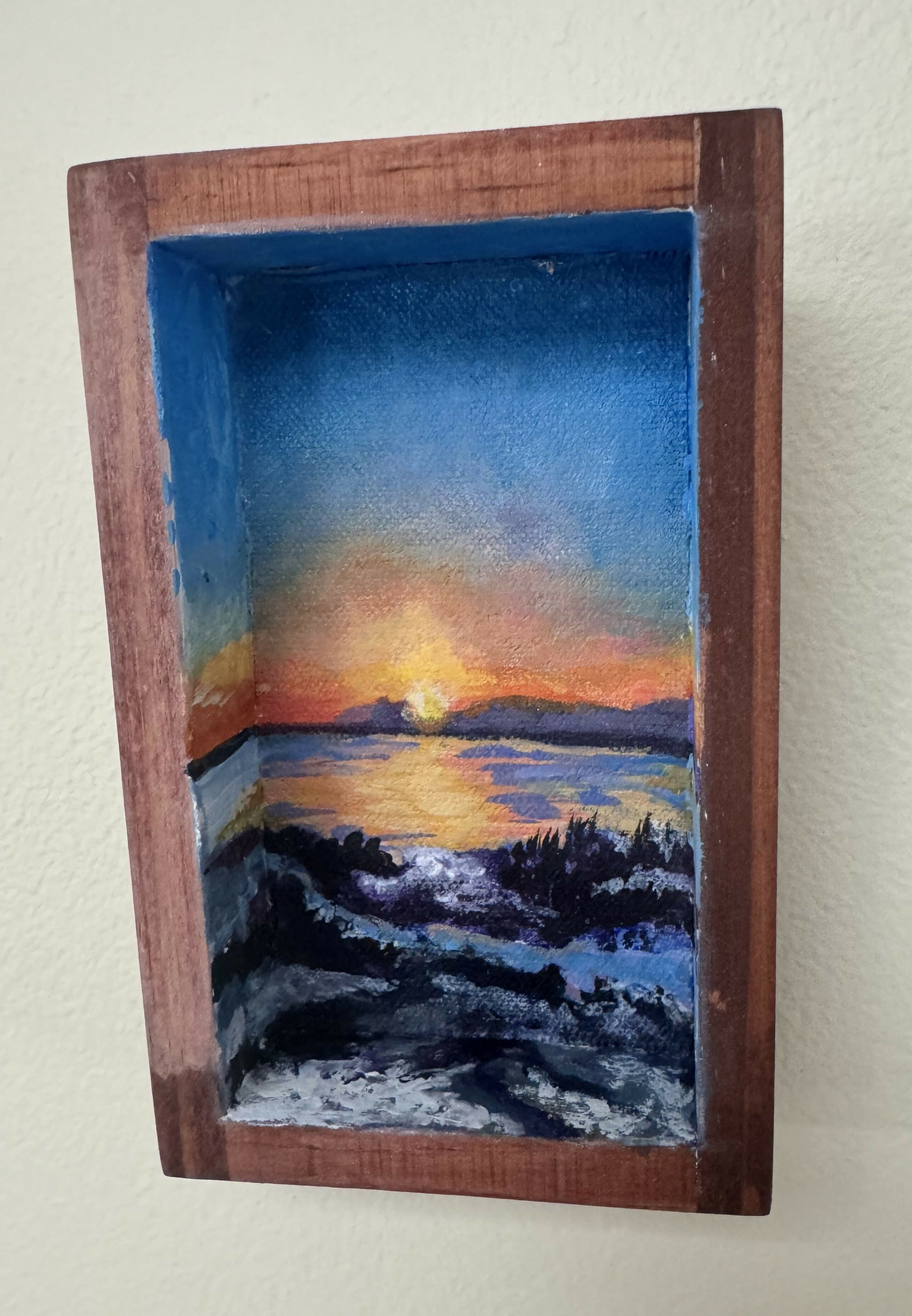 Oil painting on canvas, placed in shadow box, than landscape/ oil painting expanded into the box.