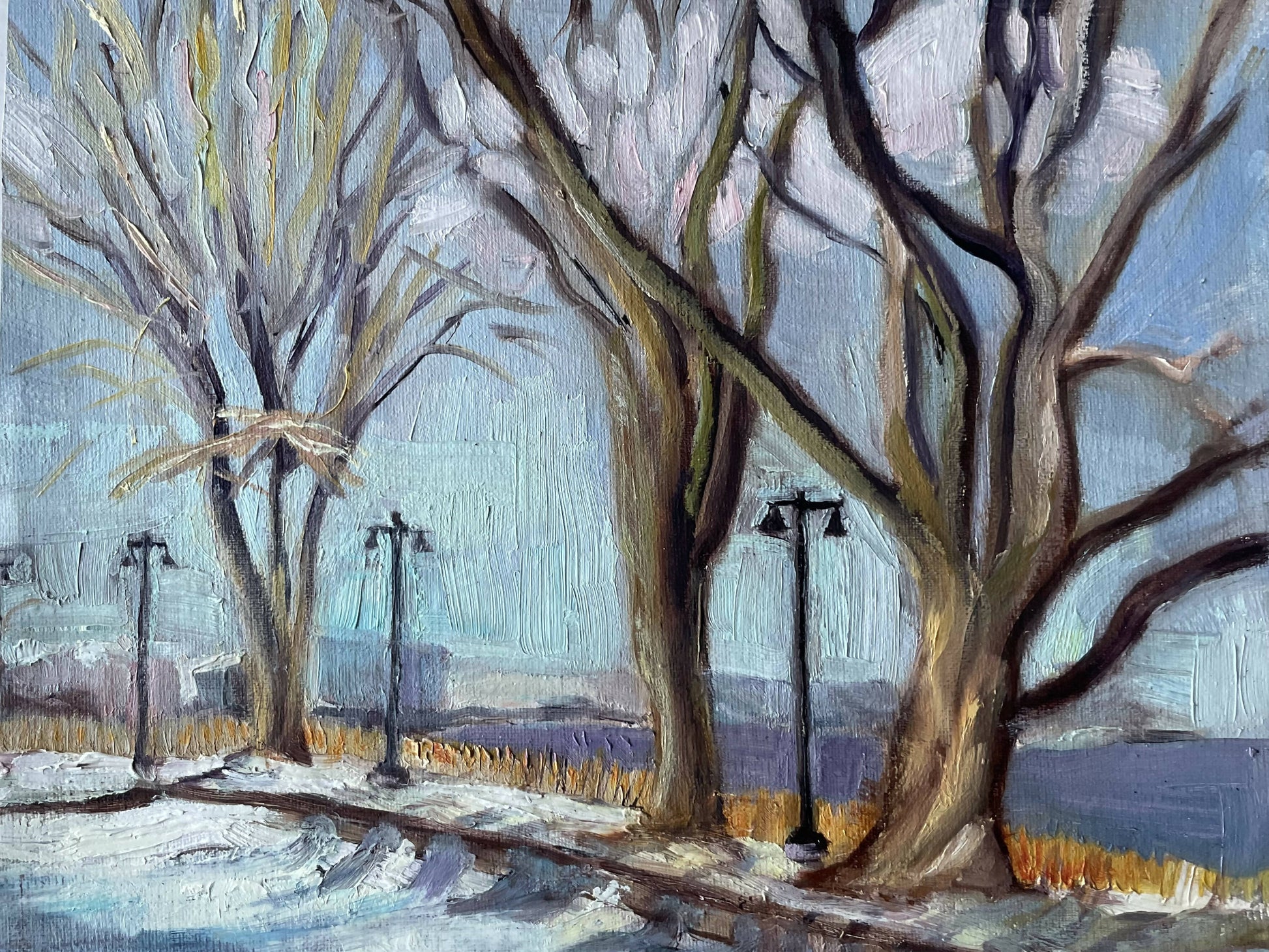 Evanston lakefront scene in February 2023. Oil. 8 x 10 , framed.